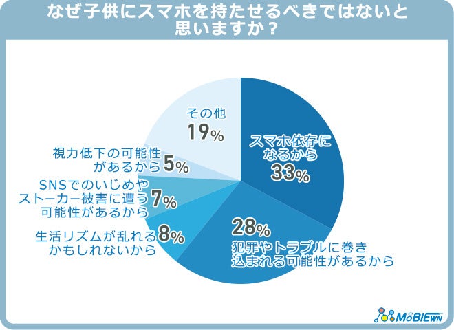 「なぜ子供にスマホを持たせるべきでないか」という旨の質問に対して、33%の方が「スマホ依存になるから」と回答しました。