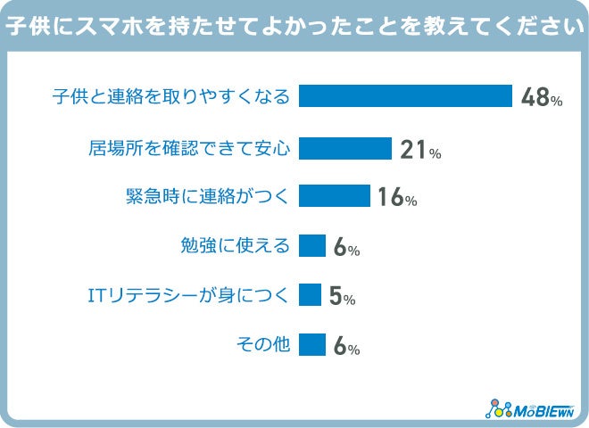 「子供にスマホを持たせて良かったことを教えてください」という旨の質問をすると、48%の方が理由に「子供と連絡を取りやすくなった」と挙げました。
