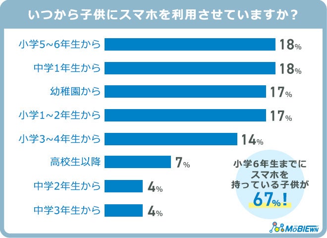 「子供にスマホを持たせ始める時期」に関するアンケート結果として、全体の67%の親が「小学6年生までにスマホを持たせている」と回答しました。