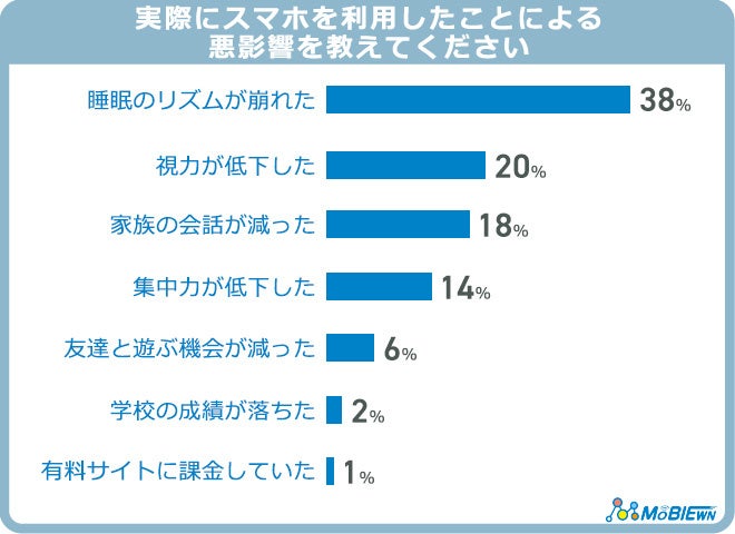 「実際にスマホを利用したことによる悪影響を教えてください」というアンケートによると、38%の方が「就寝時間が遅くなったなど睡眠のリズムが崩れた」と回答しています。