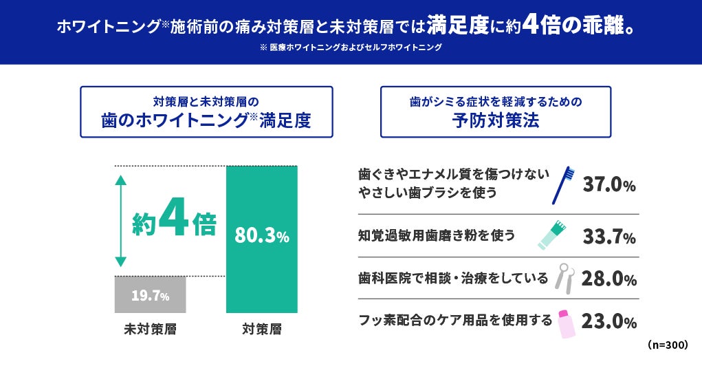 歯のホワイトニング※の満足度を左右するのは「シミる症状への予防対策」が鍵。予防対策をしている層の満足度は80.3%に達し、未対策層の19.7%と比較して約4倍の乖離。