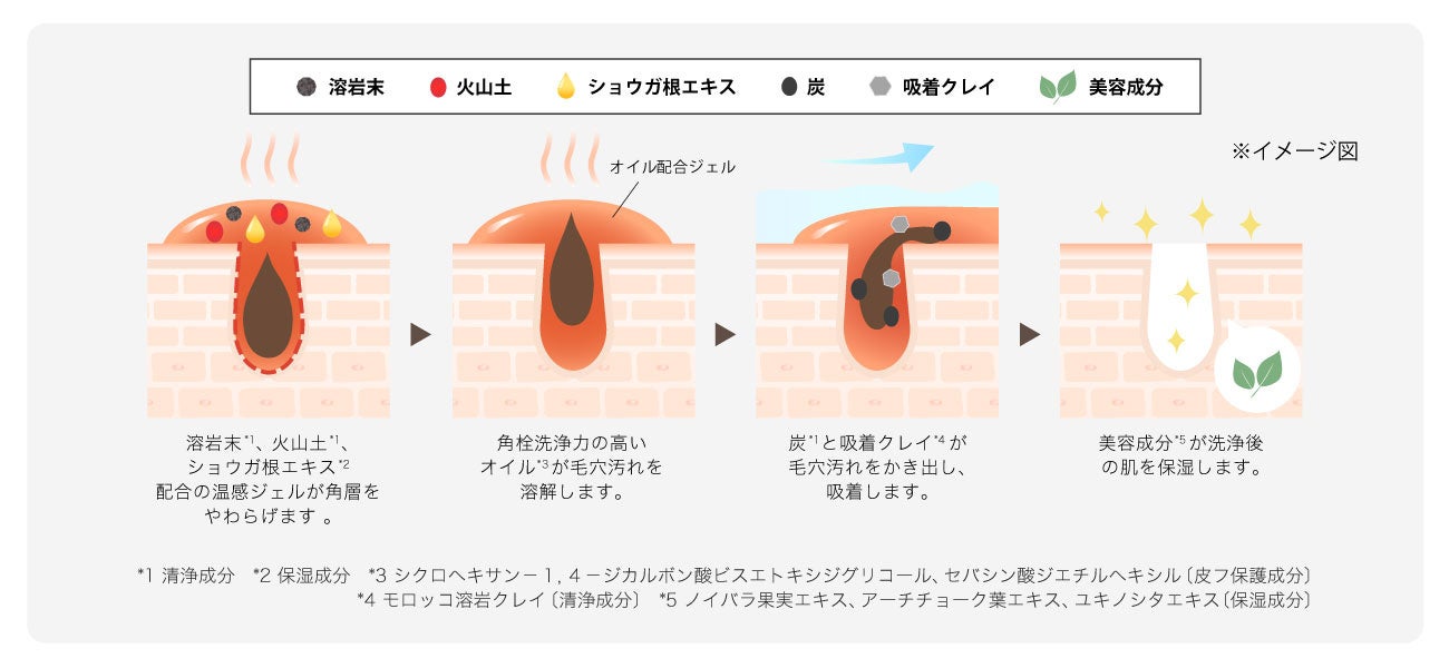 4種のミネラルパウダー*2を配合した毛穴ディープクリア処方で、じんわり肌をほぐしながらガンコな毛穴の黒ずみ*3・角栓・皮脂汚れもメイクもごっそり落とす、まるで“マグマ”のようなどろっと温感クレンジングジェル。