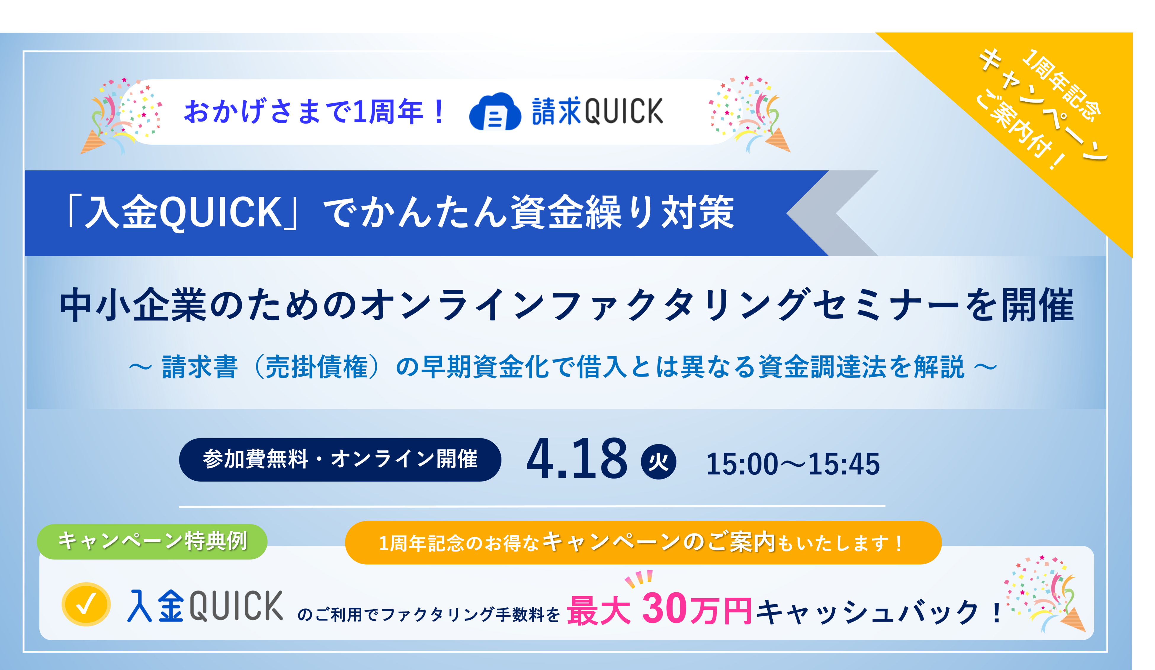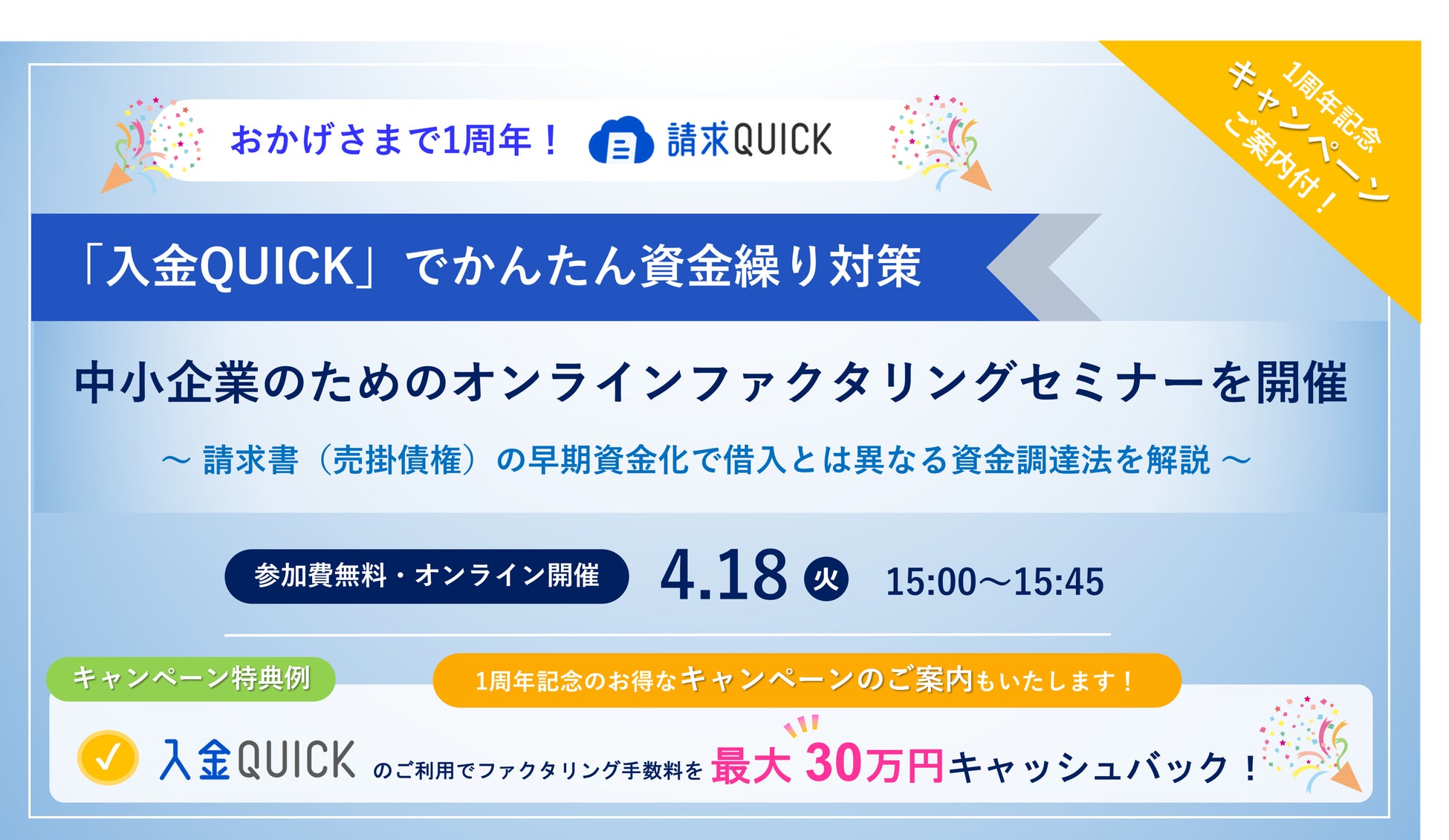 「請求QUICK」のオンラインファクタリング「入金QUICK」で実現する「中小企業のためのかんたん資金繰り改善セミナー」を4月18日に開催
