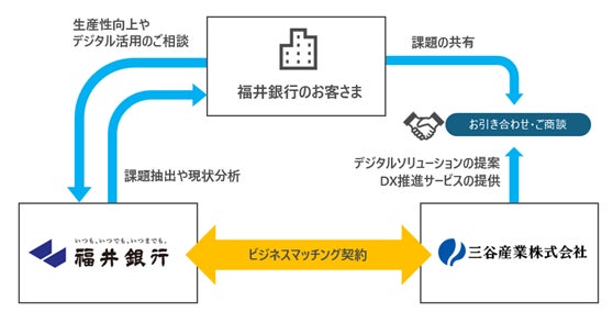 三谷産業株式会社(本社:石川県金沢市/代表取締役社長:三谷 忠照、以下 三谷産業)は、株式会社福井銀行(本店:福井県福井市/頭取:長谷川 英一、以下 福井銀行)と、福井銀行の顧客企業に対して三谷産業が提供するデジタルソリューションやDX推進サービスを提案することを目的とした「ビジネスマッチング契約」(以下 本契約)を締結しました。本契約により、福井県内企業のデジタル化推進を強化し、生産性向上やDX人材不足等の課題解決に貢献します。