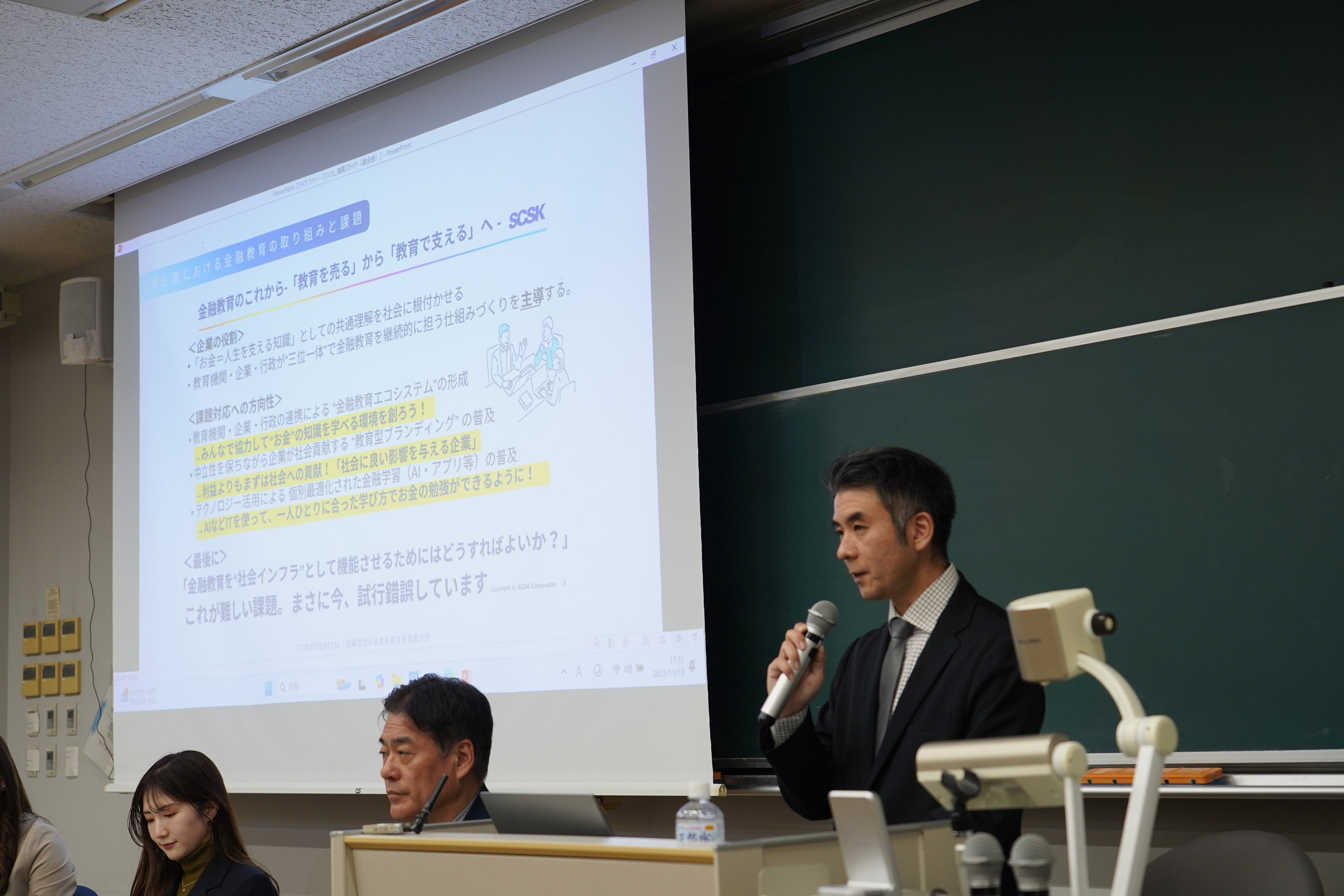 学生が金融教育の政策を検討する上では民間企業における金融リテラシー向上に関する取り組みの理解が不可欠であることから、同大学院より当連合会に対し、民間企業の実践的な取組事例、金融教育向上における課題や制度的制約、テクノロジーを活用した今後の展開、官民連携の可能性などをテーマとした講演の依頼があり、今回の講演が実現しました。