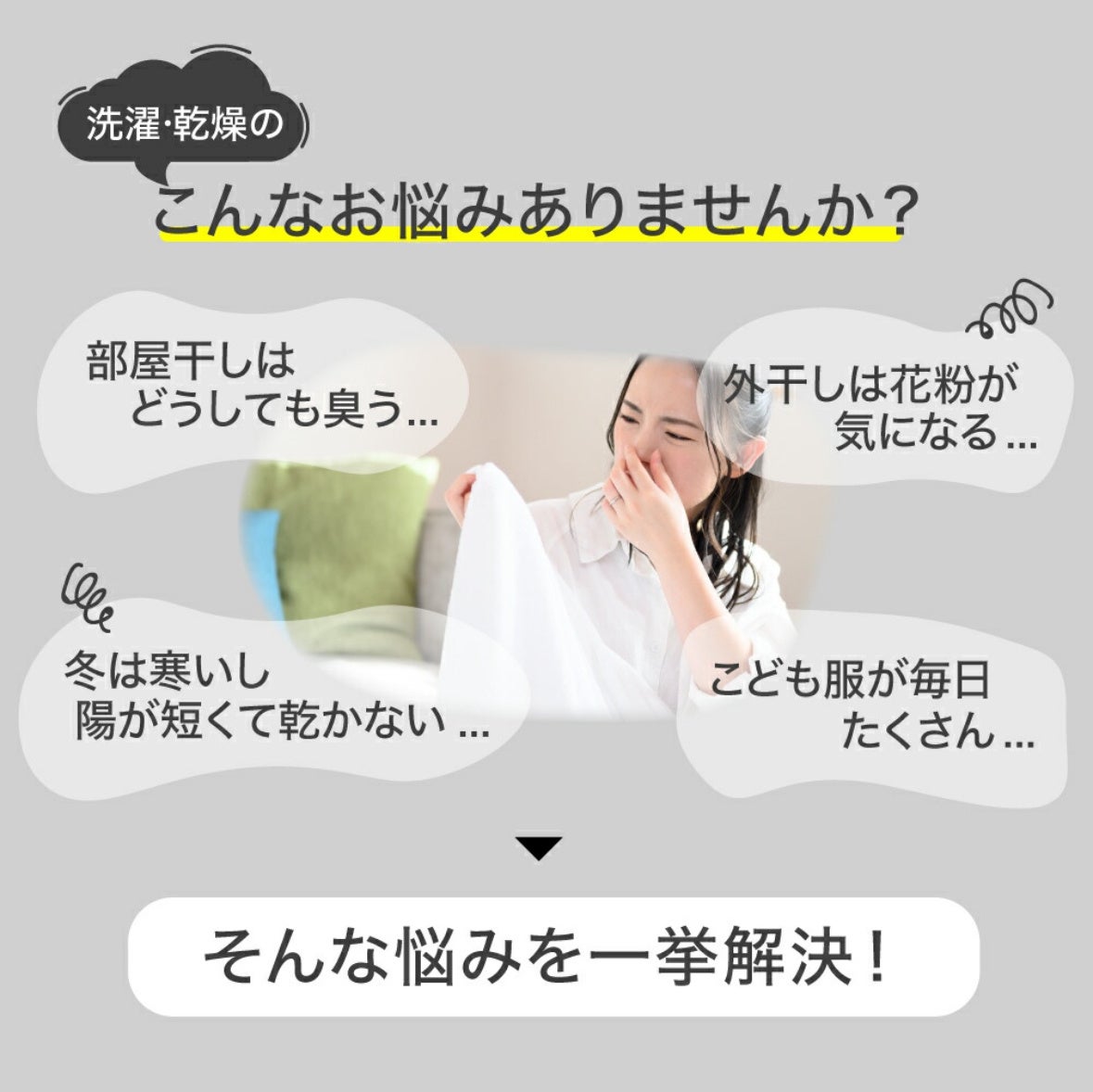 冬の部屋干しや花粉時期、梅雨時期など年中使うことができ、生乾き対策や花粉やホコリの付着予防に最適です。これからの寒い時期にはちょっとした暖房や加湿器代わりにも。