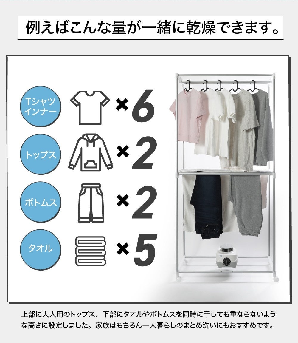 ボックス形状で効率よく干せるので、一度にたくさんの量の洗濯物を乾燥することができます。乾燥が大変なワンピースなど乾きにくい長丈衣類にも対応。