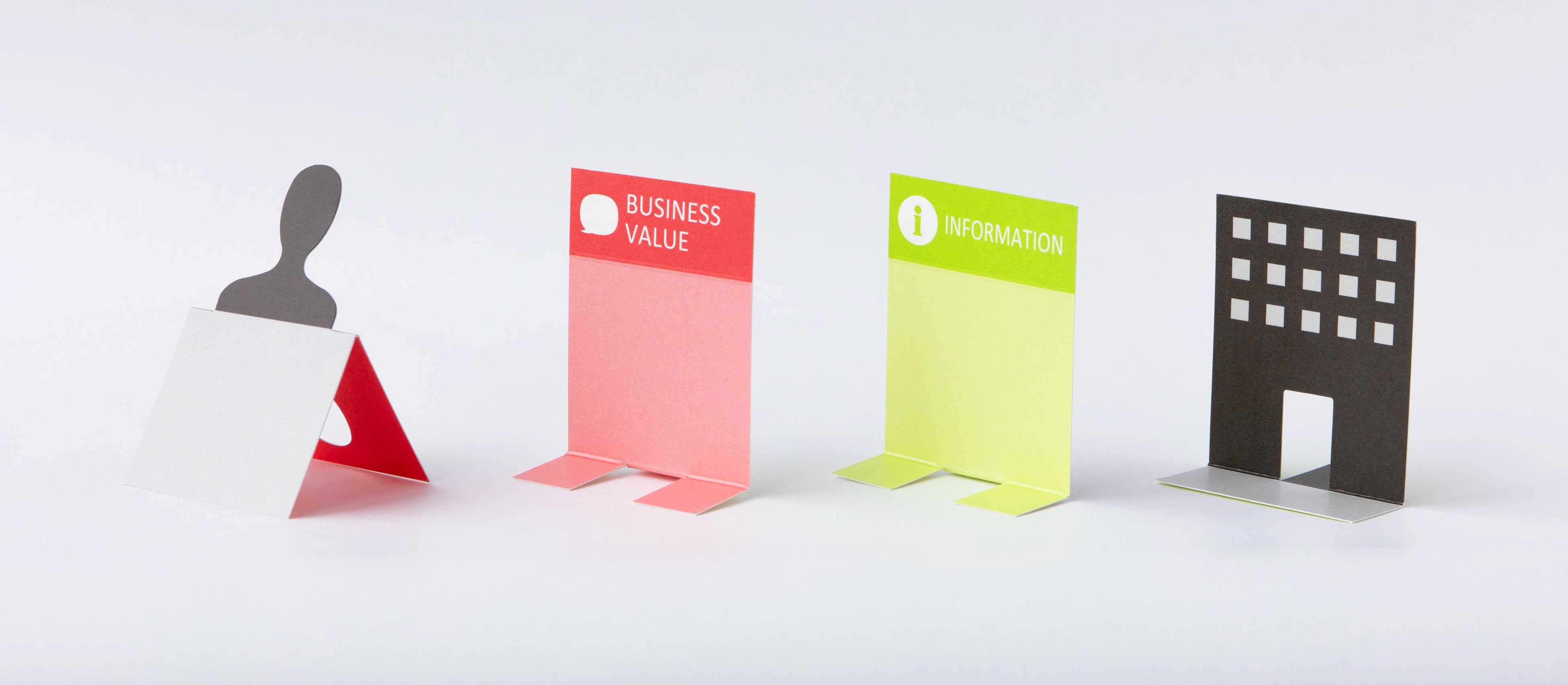 紙製のカード型ツールは2つに折ることで人型や建物、乗り物といった「折り紙」の模型を簡単に作れます。カードには具体的な名称を書き込む欄が設けてあり、ステークホルダーとその関係性を卓上に並べることでサービス構造を可視化し、全体像の理解、課題の発見・共有といった新サービスの構築に役立ちます。