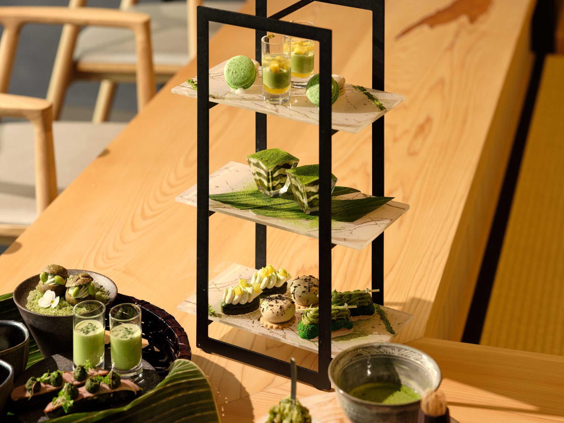 京都・和束町の自社茶畑「デュシット・ティー・ガーデン」の有機抹茶と、マンゴー、パイナップル、パッションフルーツなどのトロピカルフルーツが絶妙に調和し、初夏の爽やかな風味をご堪能いただけます。また、ほうじ茶とグリーンカレーといった、和とタイのスパイスを融合させたユニークなセイボリーなど、当館でしかお楽しみいただけない味わいを提供いたします。