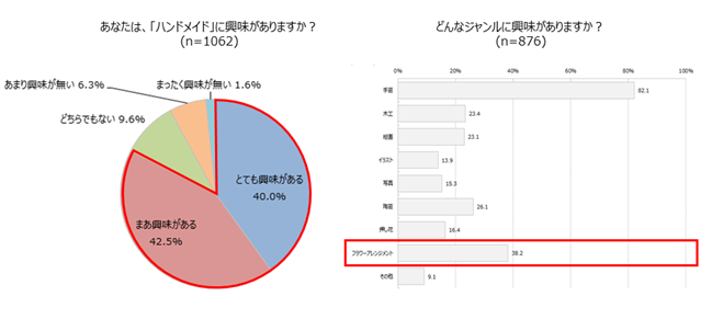 今回の取り組みにあたり、株式会社ハルメクは、ハルメク通販利用者に対し、「ハンドメイド(ものづくり)」への興味に関するアンケートを実施しました(有効回答数:1,062名)。アンケートの結果、82.5%の方が「ハンドメイド(ものづくり)」に興味があると回答し、ハンドメイドに対する興味がとても高いことがわかりました。さらに、ハンドメイドの中でも、最も興味のあるジャンルは手芸(82.2%)で、次いでフラワーアレンジメント(36.1%)と、お花への興味を持つ方が多いこともわかりました。