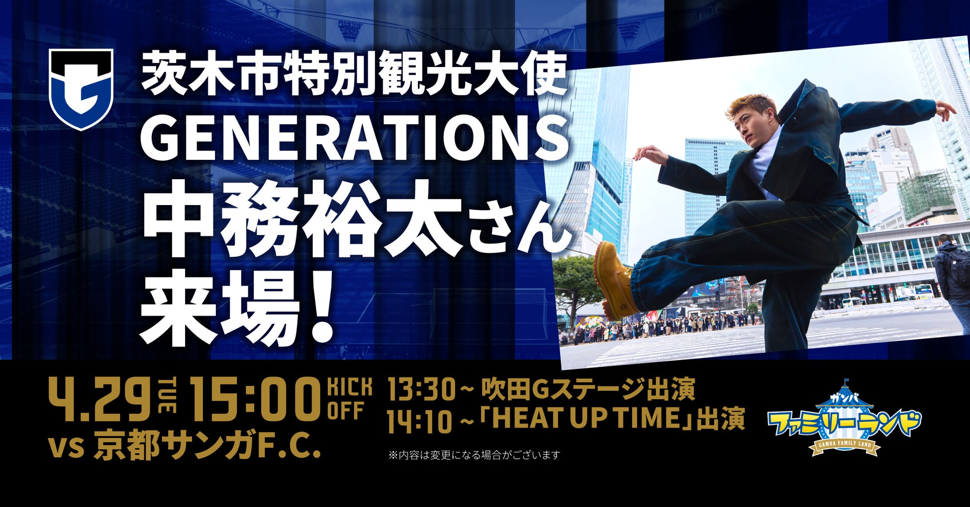 4/29(火・祝)明治安田J1 第13節 京都戦 茨木市特別観光大使 GENERATIONS 中務裕太さん来場のお知らせ