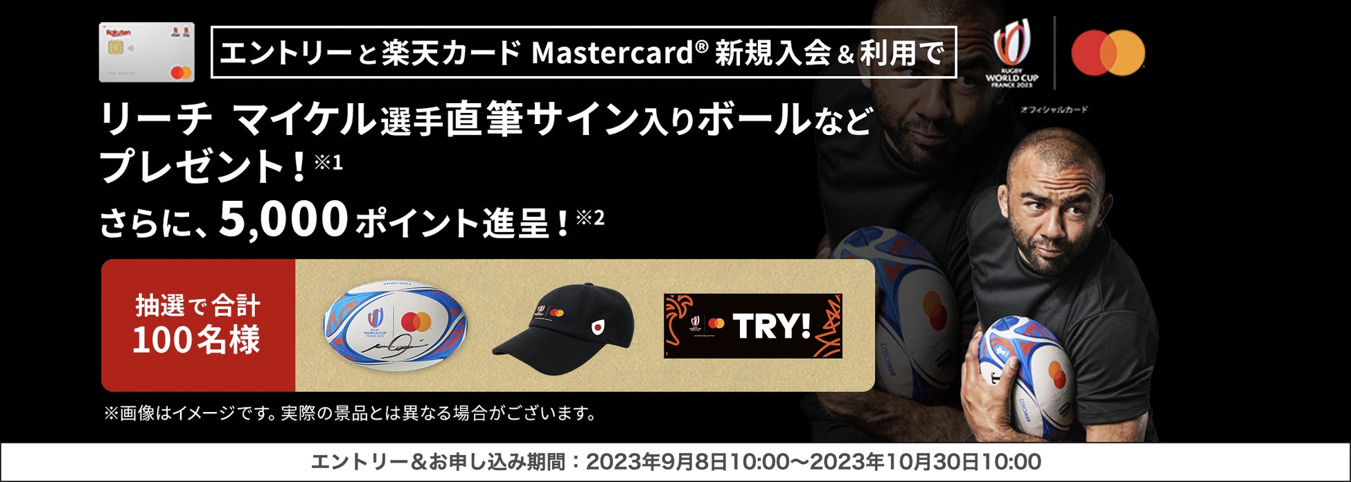 楽天カード株式会社は、2008年以来ラグビーワールドカップのワールドワイドスポンサーを務めるMastercardの協力のもと、同社のラグビー・アンバサダーを務めるリーチ マイケル選手の直筆サイン入りボールなどを楽天カードMastercard®新規入会&利用された方に抽選で合計100名様にプレゼント(※1)するキャンペーンを本日9月8日(金)より開催いたします。また、条件達成いただいた方に、もれなく5,000ポイントを進呈(※2)いたします。
