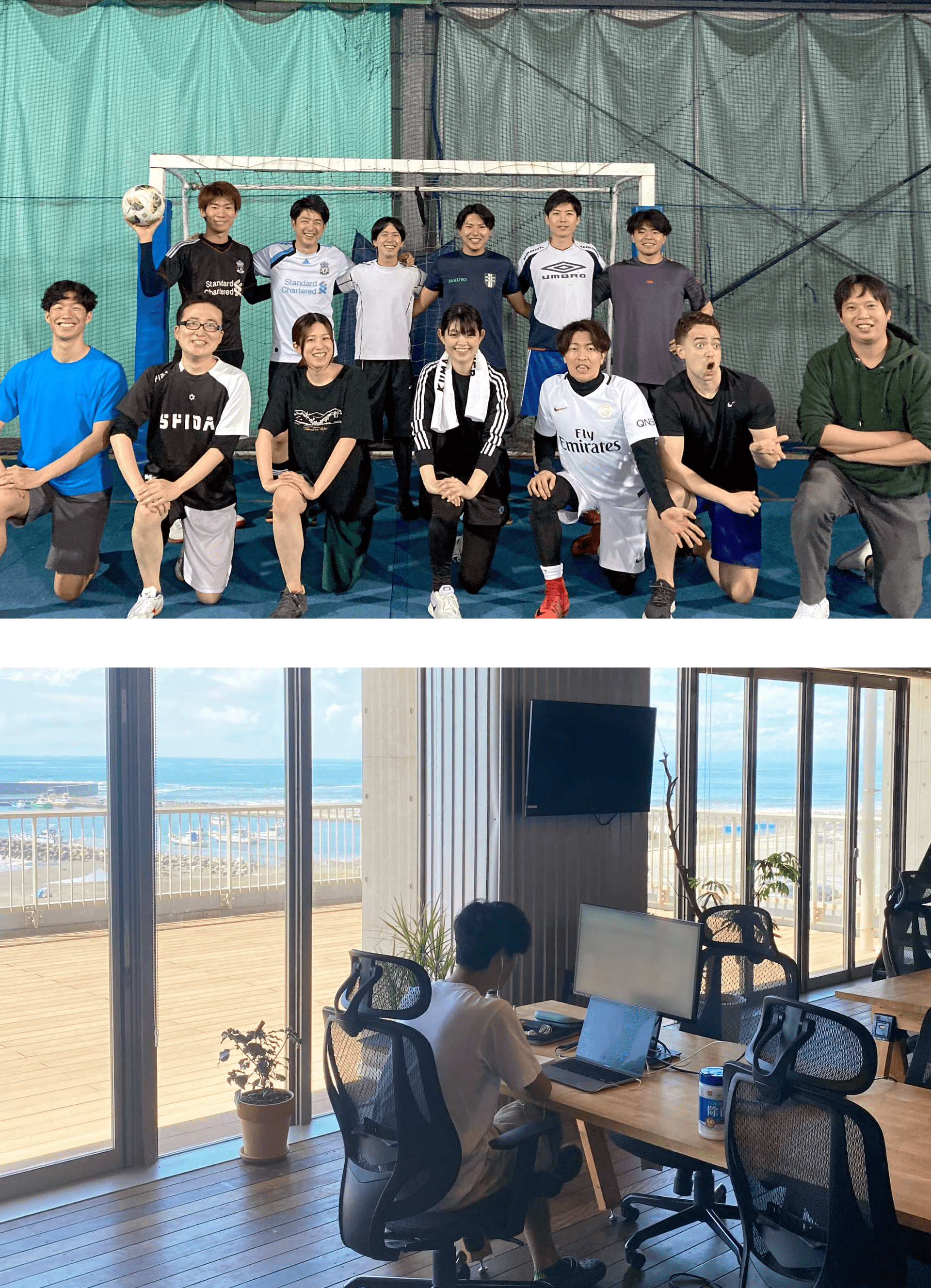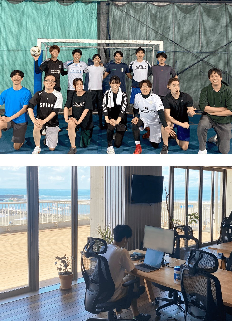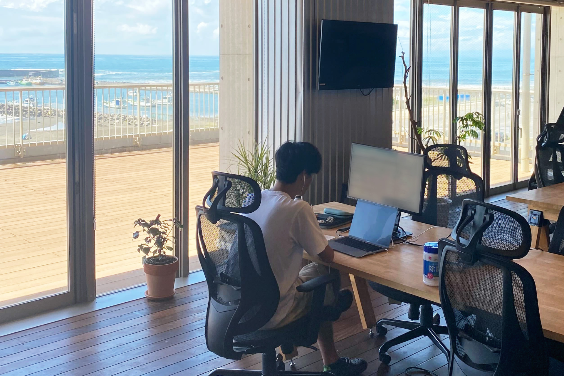 在宅勤務の課題である慢性的な肩こりや運動不足による健康被害の防止のため、通いたくなるオフィスづくりに注力。海の目の前の開放的なロケーションで仕事とリフレッシュの両立を実現しました。