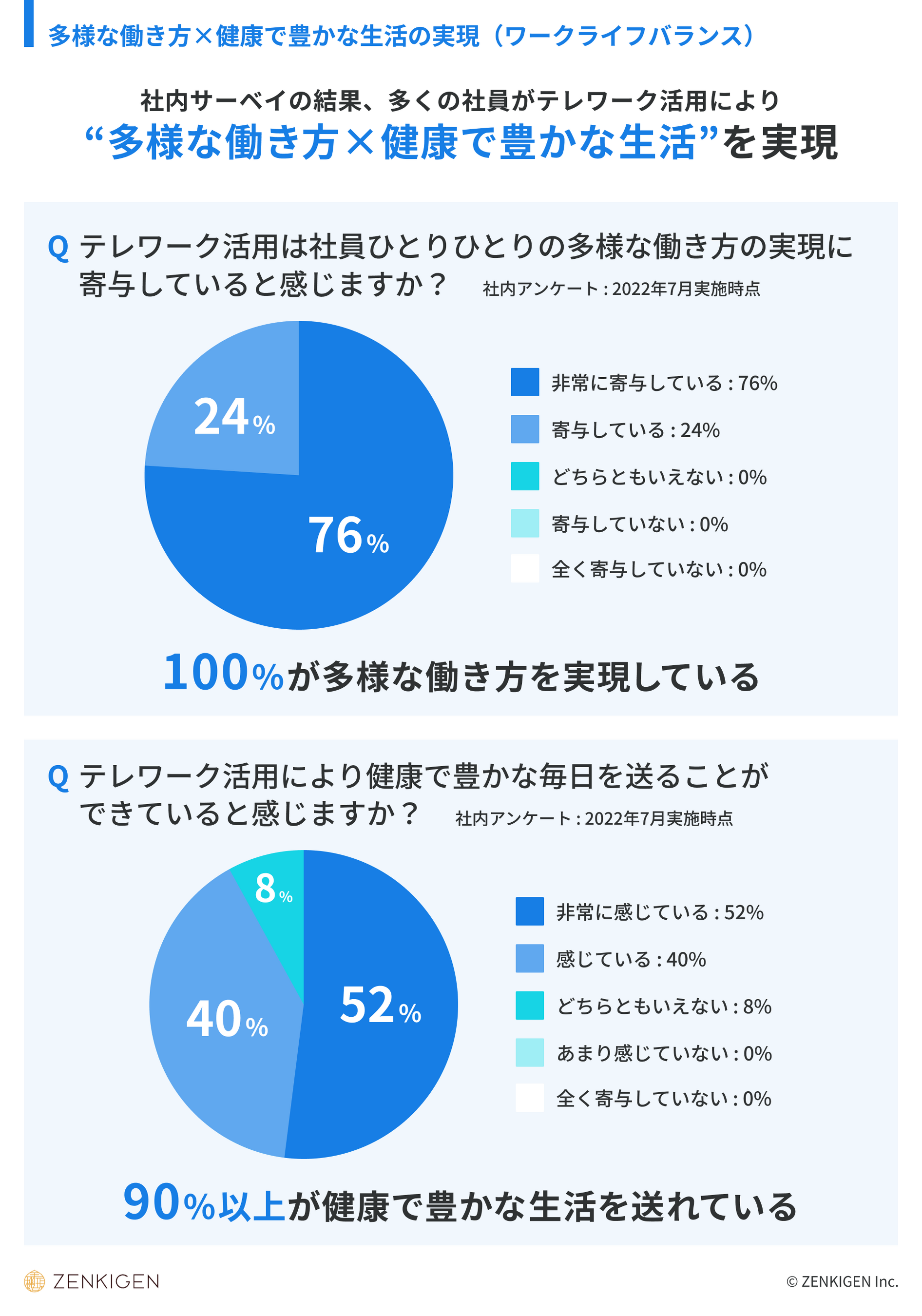 100%の社員がテレワークを活用しており、全員が生産性が向上しており、92%が健康で豊かな生活を送れていると回答しています。全社員のうち9名が関東近郊以外の地域に在住しており、住む場所にとらわれずに自身の仕事に邁進する環境づくりを実現しています。