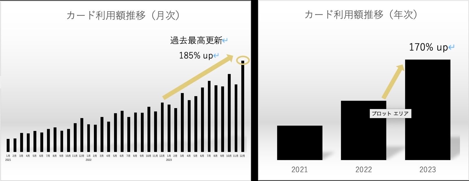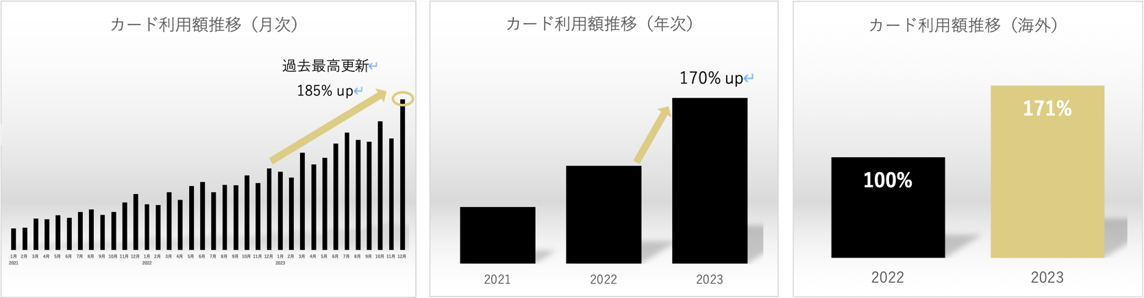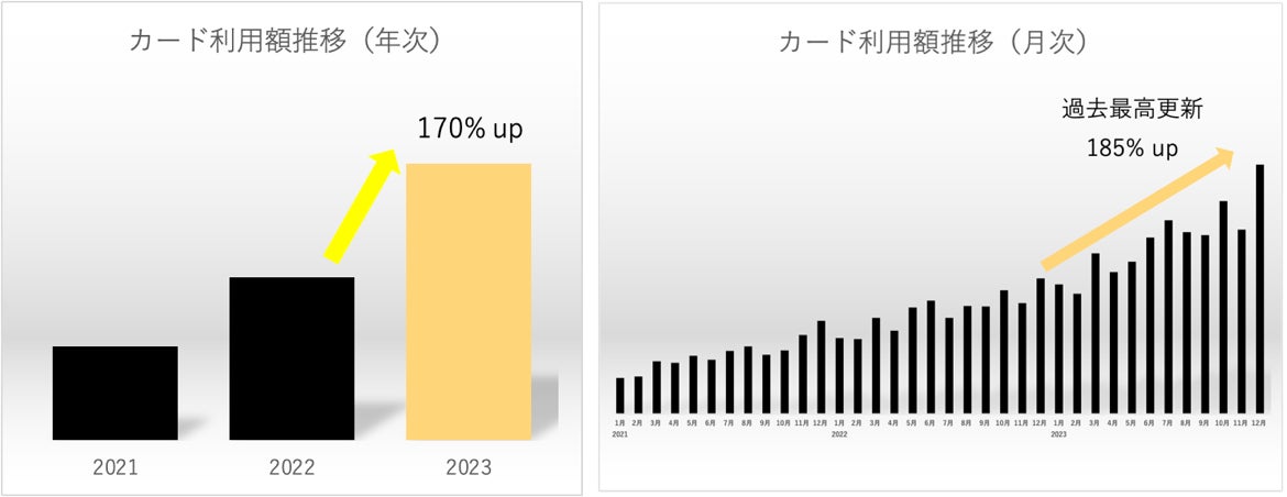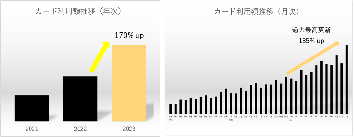 ・2023年12月単月のカード利用金額は前年同月比185%と過去最高記録をマーク。