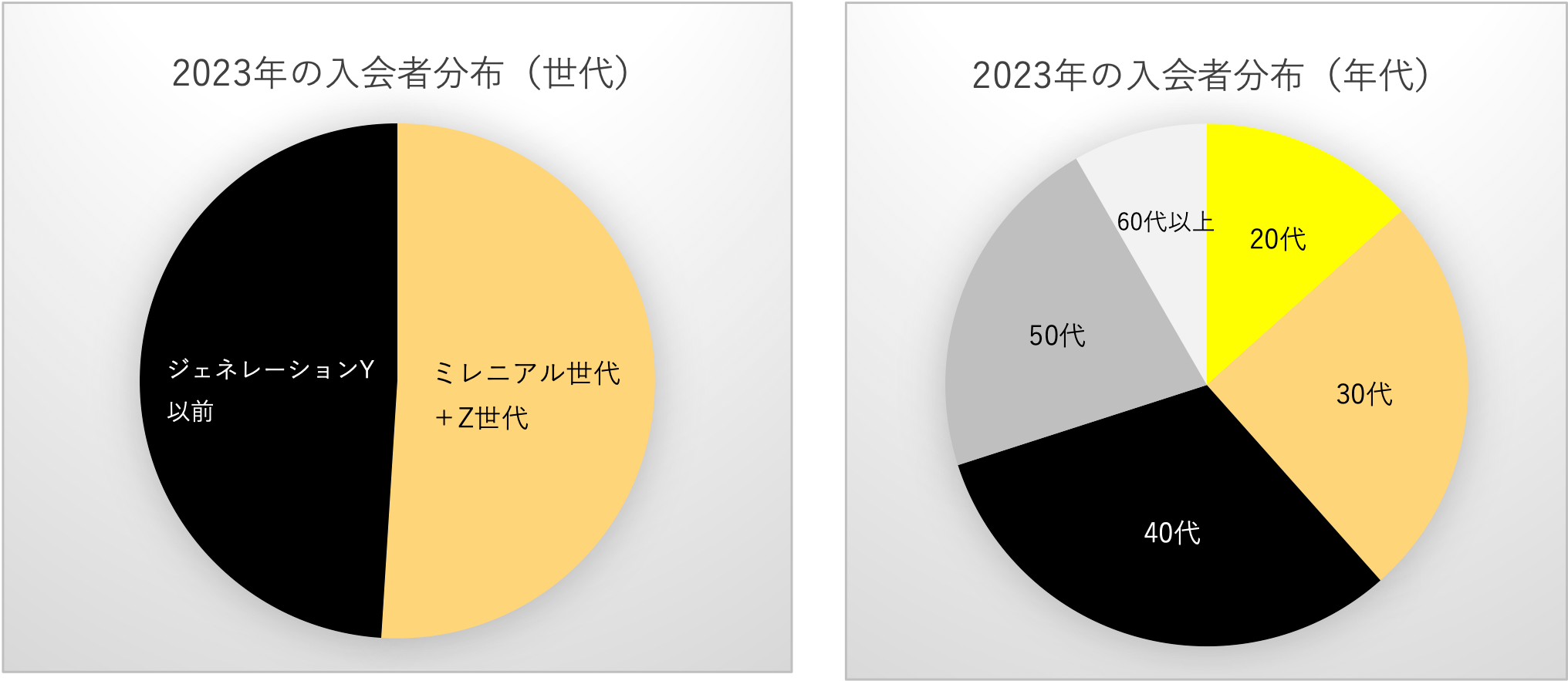 2023年入会者の年齢分布はミレニアル世代(1980年以降生まれ)以降の入会が半数以上。