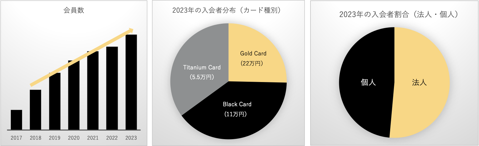 Titanium Cardの5.5万円(税込)から、最上位Black Diamond 66万円(税込)という高額な年会費にも関わらず、右肩上がりで成長を続け、会員数は7年で4.7倍近くに成長。特に年会費が高いカードの入会が多いことが特徴。65%が上位層カードを求めて入会しています。
