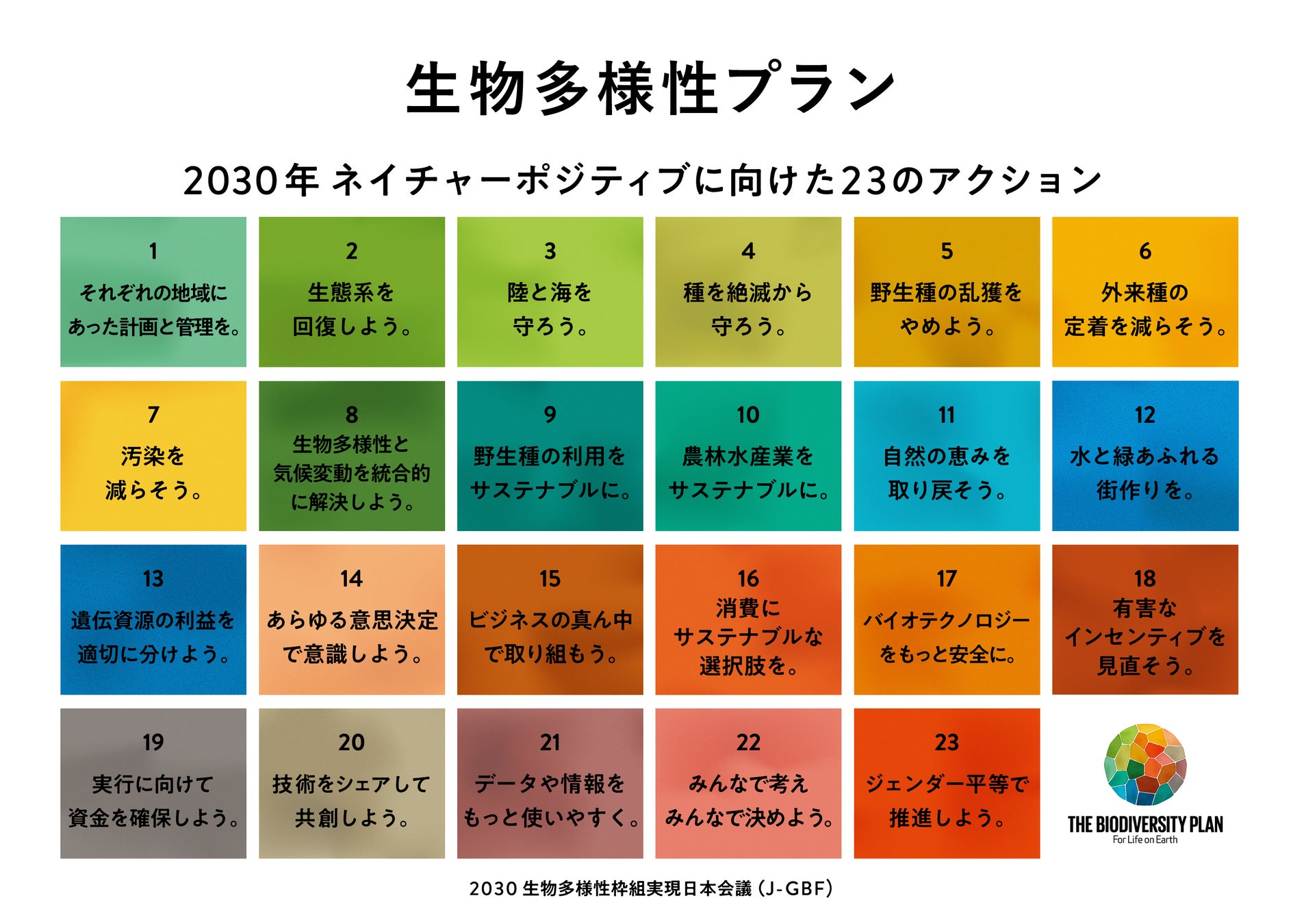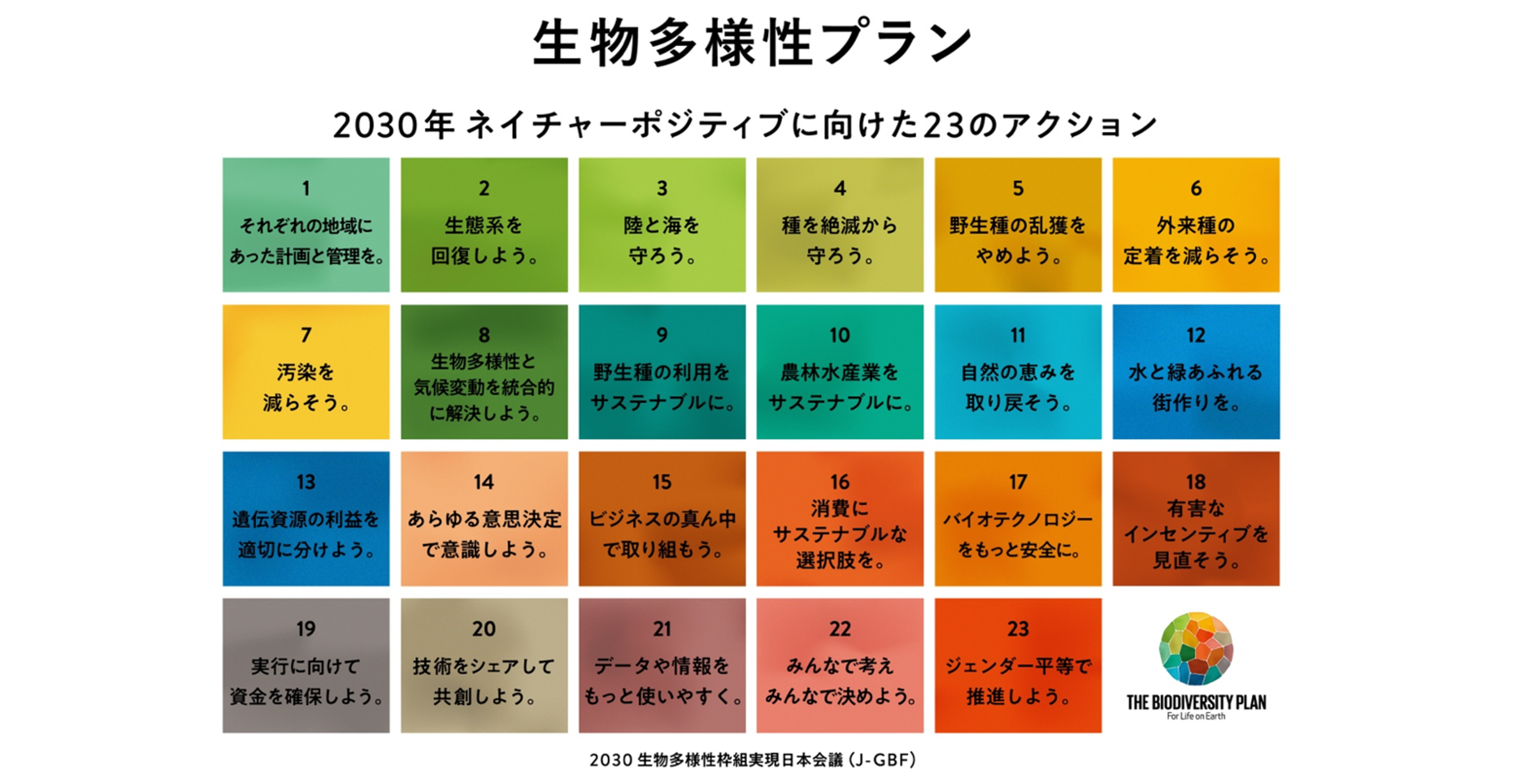 生物多様性に関する世界目標。2022年12月にカナダのモントリオールで開かれた生物多様性条約第15回締約国会議(COP15)で採択されました。