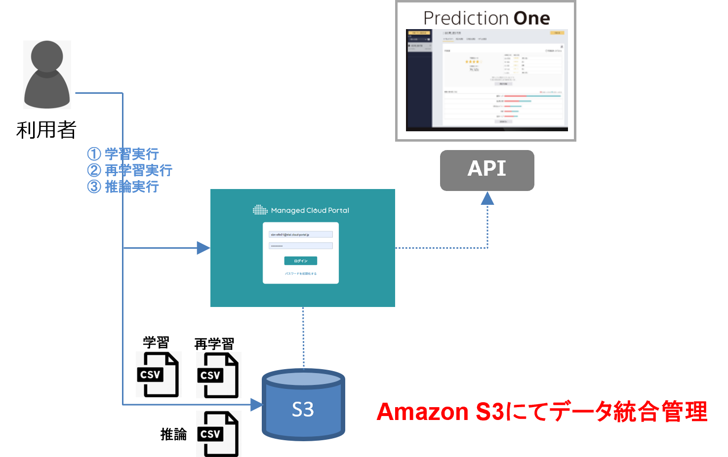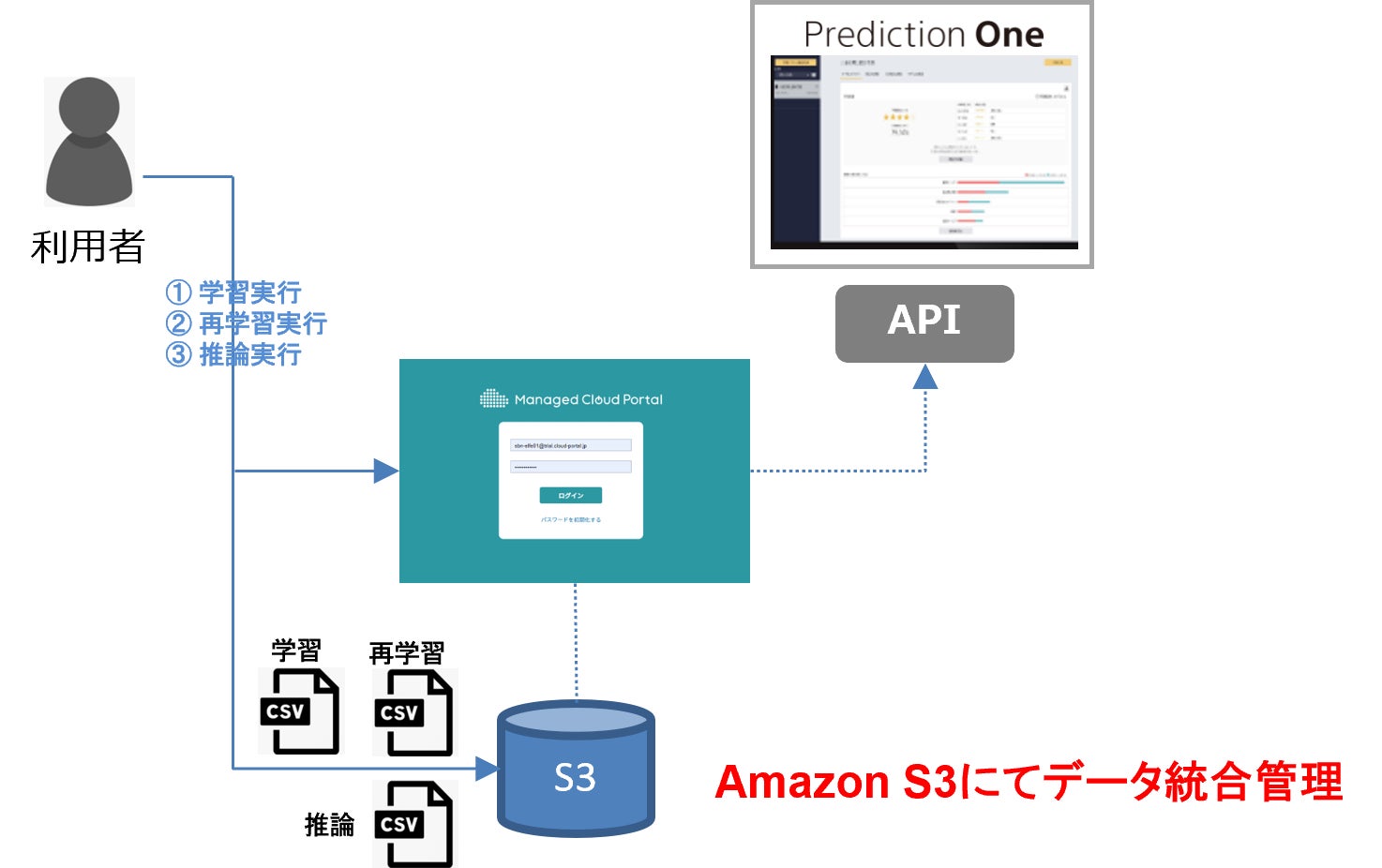 今回のAPI連携により、「マネージドクラウド with AWS」のポータル上で、ユーザーが学習データをAmazon S3に格納すると自動的に予測モデルの配置が実行され、完了時に通知を受け取ることができます。これにより、ユーザーが機械学習のプロセスを意識せずに、AIによる予測分析を自社のシステムに容易に連携することができ、予測分析の活用用途を広げ、業務へのAI活用を素早く反映させることが期待できます。