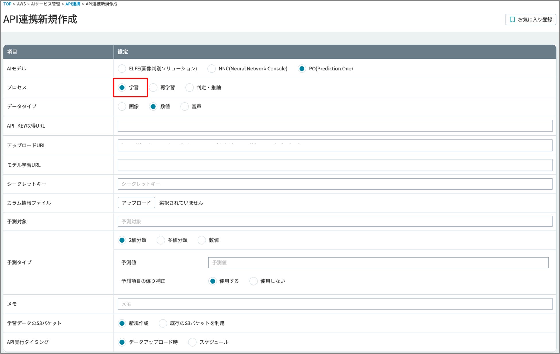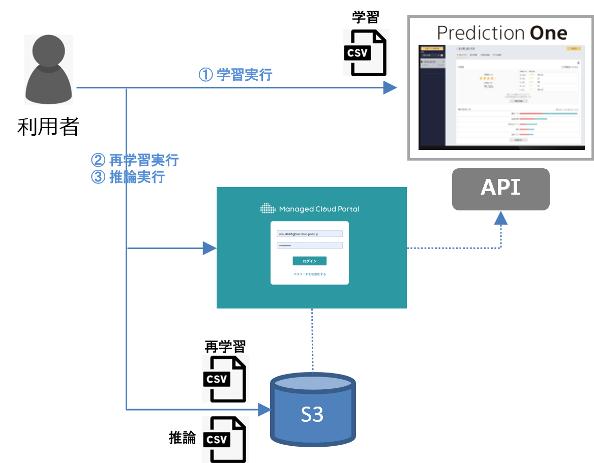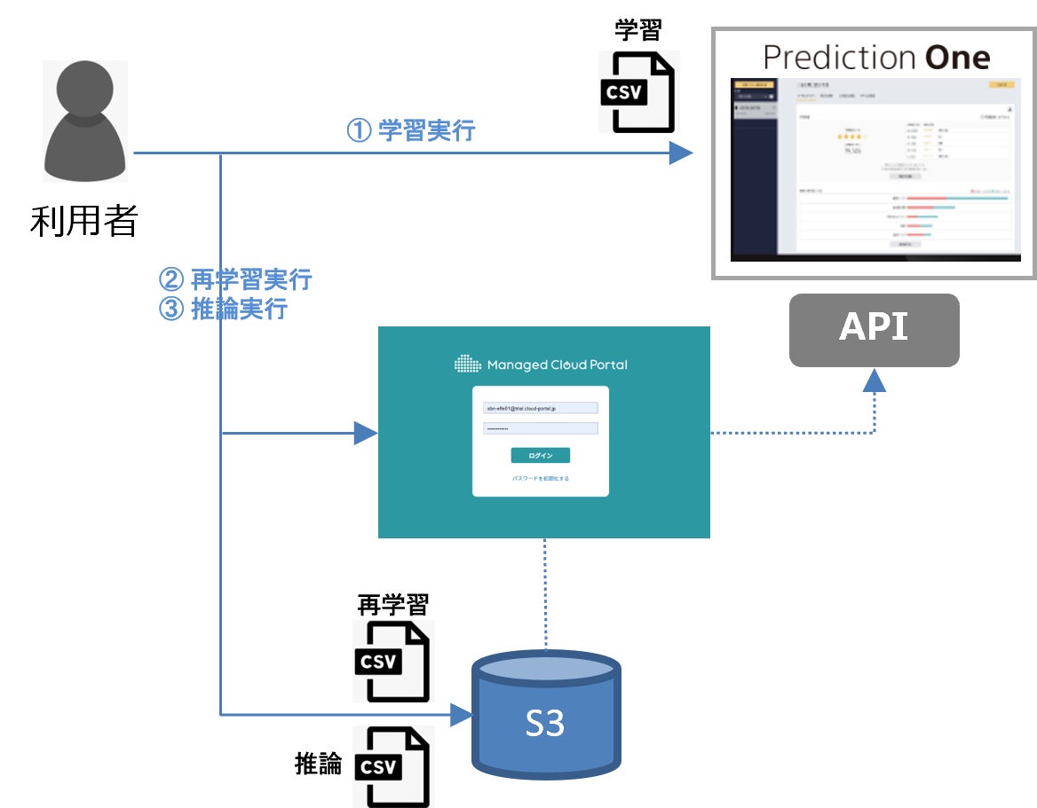 「Prediction One」は、小売業や製造業の方を中心に、販売予測や需要予測といった用途で利用されています。これまで予測モデルを作成する際には、ユーザーが「Prediction One」に手動でデータをアップロードした後に設定項目を選択し、予測モデルが作成されるまでに時間を要していました。これらの作業を短縮するため、「Prediction One」では学習API機能が追加されましたが、ユーザーがAPIをコールするシステムを実装する必要がありました。