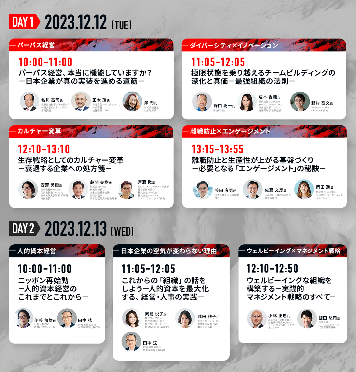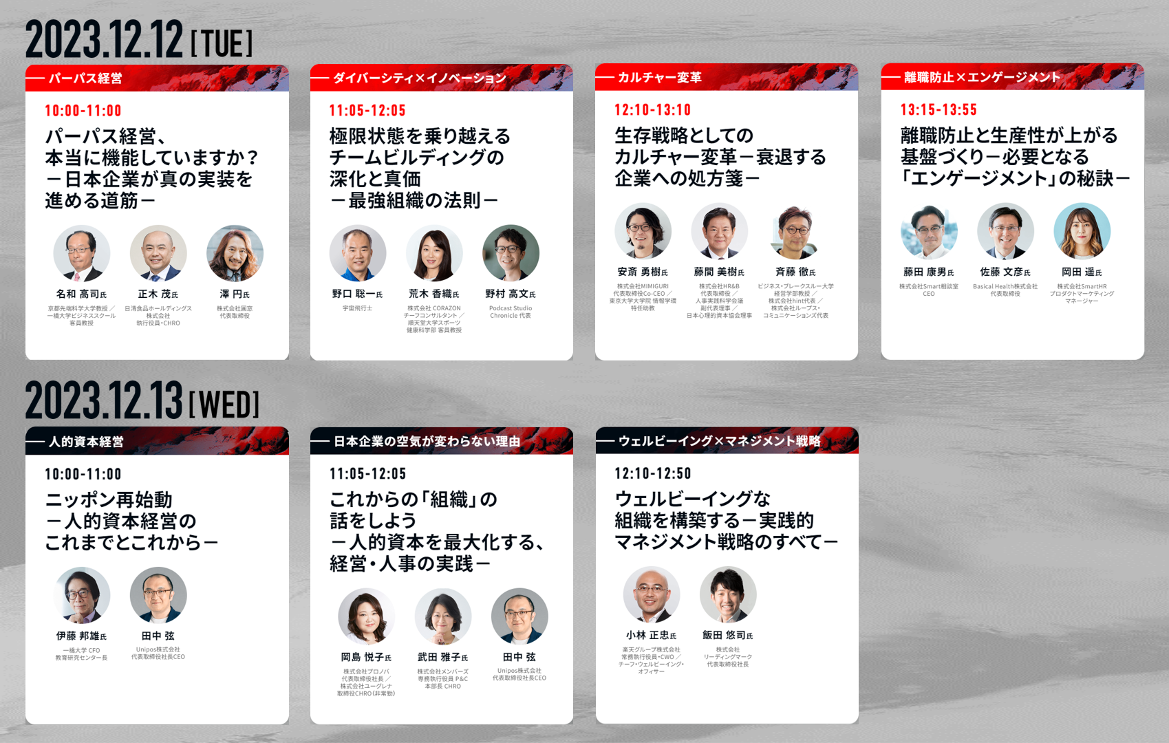そこで、「Unipos Summit 2023 winter」では、各界の有識者をお招きし、人的資本・パーパス・カルチャー・ダイバーシティをキーワードに、経営・人事の最先端を学ぶイベントを開催します。