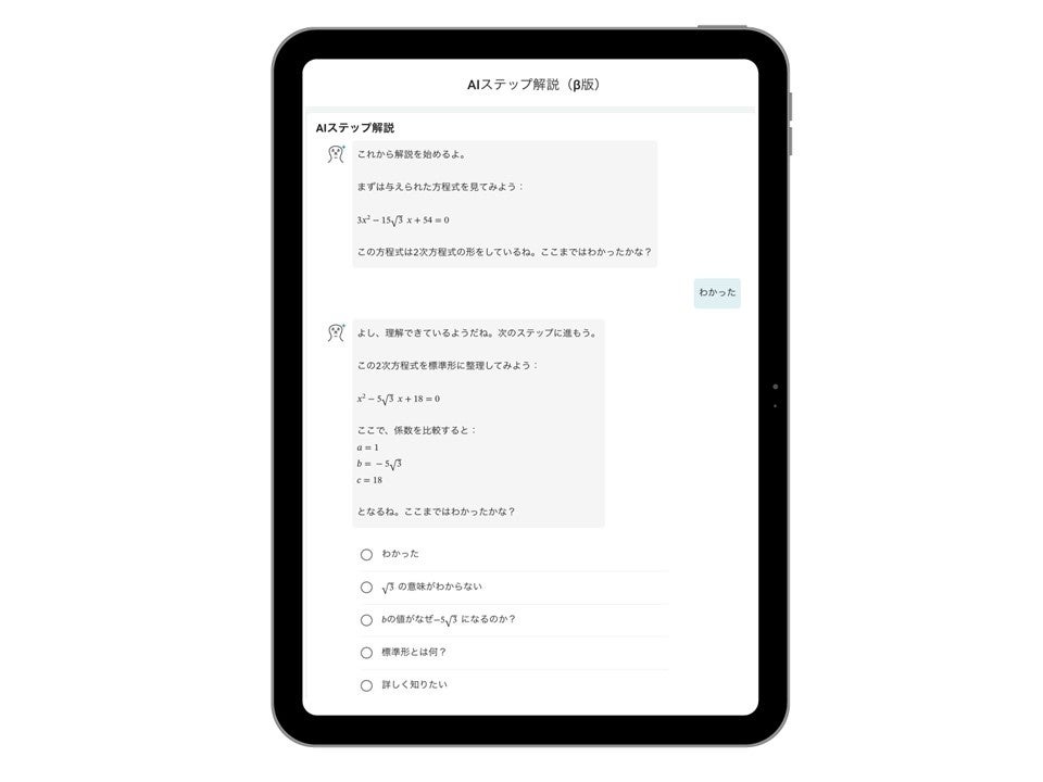 今回開発した機能は、生徒一人ひとりに合わせた解説を行う「AIステップ解説(β版)」です。atama+では、すべての演習問題に解説を搭載しており、生徒が問題を解いた後に解説を読み復習することで学習効果を高められるようにしています。しかし、生徒によっては解説を読むだけでは内容を理解できず、その結果、学習のモチベーションが下がったり、解答を丸暗記してしまったりすることがあります。本機能では、AIが生徒の理解度を段階的に確認しながら解説を行います。わからない箇所が特定された上で、より丁寧な解説を受けることができるので、生徒はスムーズに学習を進めることが可能となります。