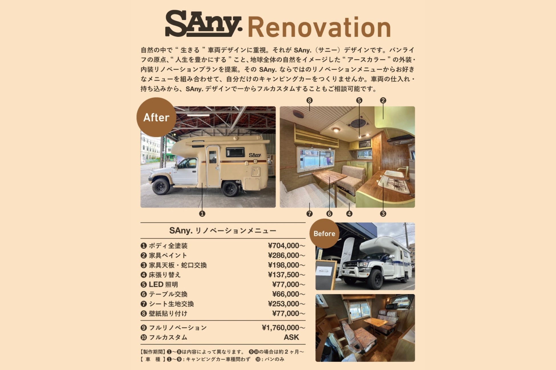 Carstayの「SAny(サニー).」は、新・中古車両の仕入れ、顧客が持ち込んだ車両をキャンピングカーまたは車中泊仕様に改造する「フルカスタム」、中古や旧式キャンピングカーの外装や内装のデザインを改修する「フルリノベーション」などを含む新たなサービスです。