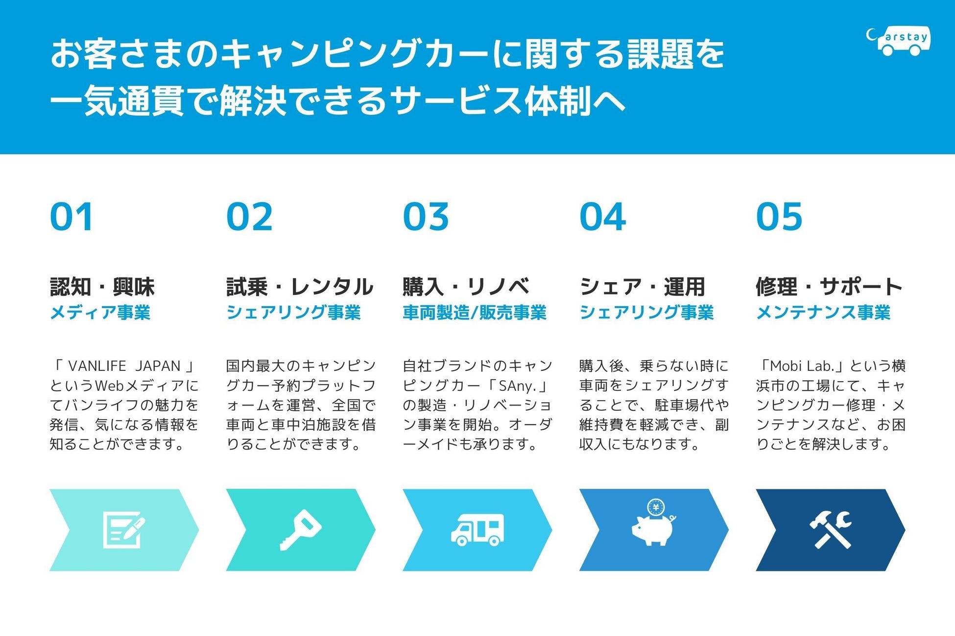 Carstay株式会社は「誰もが好きな時に、好きな場所で、好きな人と過ごせる世界をつくる」というミッションを掲げ、移動を基盤にあらゆるサービスを提供する概念「MaaS(Mobility as a Service)」領域で新しい旅と暮らしのライフスタイル「バンライフ」をテーマに事業を展開するスタートアップ企業です。2019年1月に車中泊スポットのスペースシェア、2020年6月にキャンピングカーのカーシェアを発表し、全国各地に車中泊スポットを約340箇所、キャンピングカーシェア登録車両を400台に拡大するなど国内最大の「バンライフ」のプラットフォーム事業を展開。さらに、2022年10月に横浜市にて、バンライファーのためのシェアガレージ「Mobi Lab.(モビラボ)」を開設、2023年に自社ブランドのキャンピングカー製造を開始。(https://carstay.jp/)