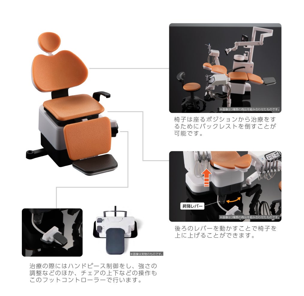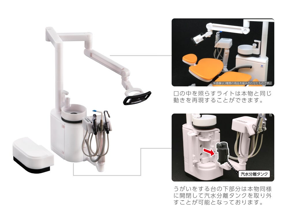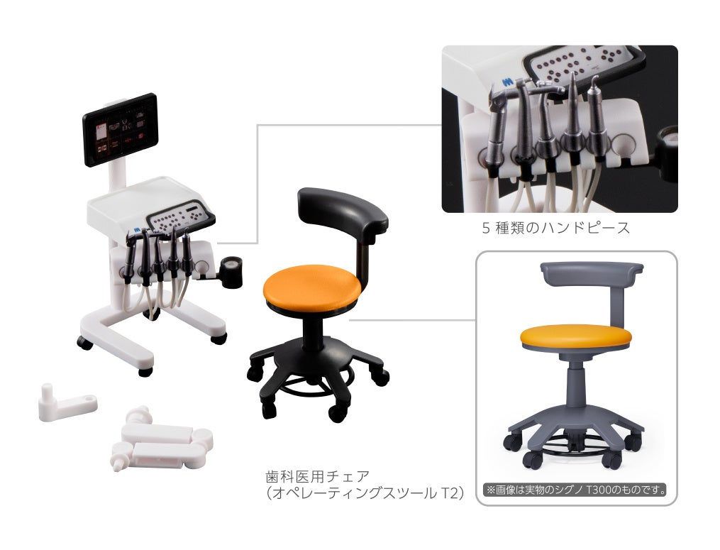 本商品は歯科チェア国内大手製販売社の株式会社モリタとの共同開発により、 全国の歯科医院で使用されている「シグノ T300」を患者用の椅子とその周りの機器も本物同様に 1/12 のサイズで再現したリアルフィギュアで、歯科チェア、歯科衛生士パート、歯科医パートの 3 つを集めると 歯科医院さながらの歯科チェアが完成します。