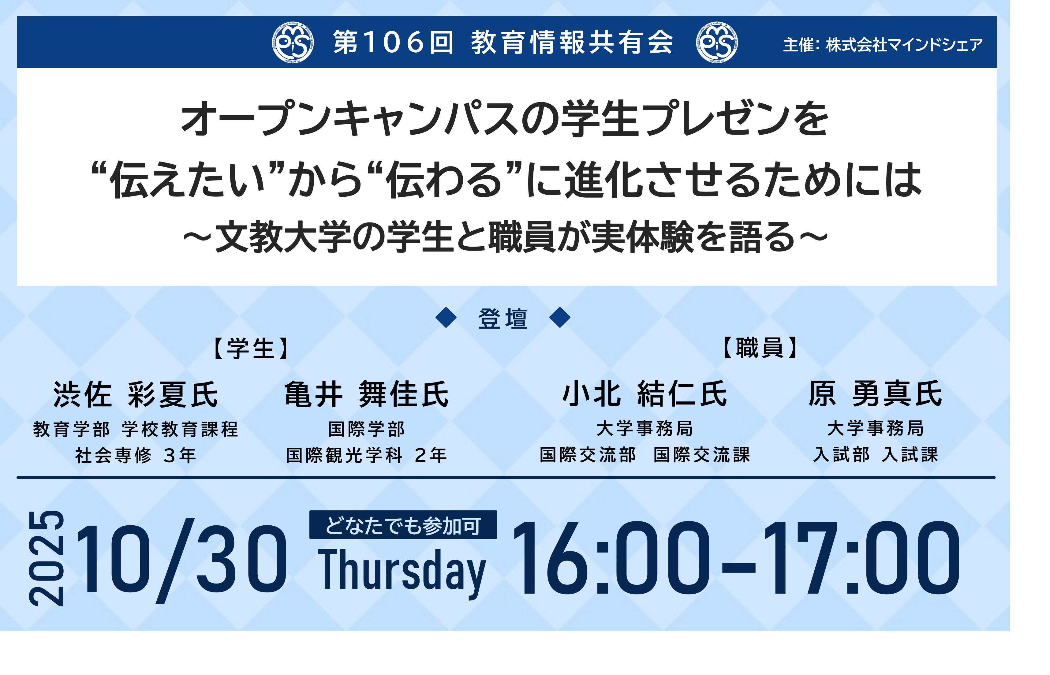 【教育機関の方限定:無料】10月30日(木)第106回教育情報共有会「オープンキャンパスの学生プレゼンを“伝えたい”から“伝わる”に進化させるためには~文教大学の学生と職員が実体験を語る~」