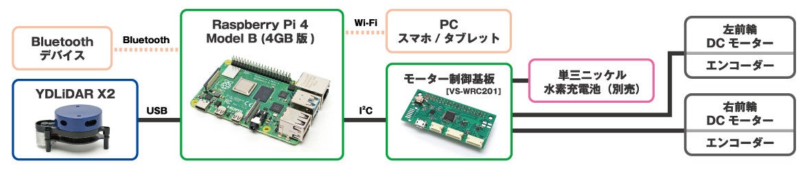 また、モーターの制御基板として「VS-WRC201」を新規開発し、エンコーダーからの出力値をRaspberry Pi 4に入力すると共に、効率の良いモーター回転制御を実現しています。