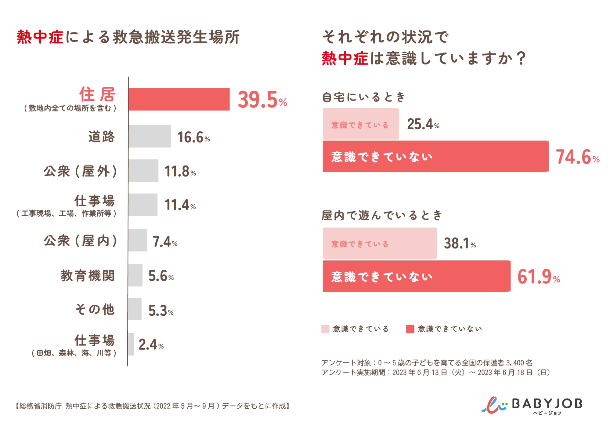 総務省消防庁によると、令和4年5~9月に熱中症で救急搬送された患者の5人中2人は発生場所が”住居”であり、屋外の公共の場所で発症した患者も含めると、半数を上回っていたことを発表しています。一方、BABY JOBの調査結果では、子どもの熱中症に対して「自宅にいるときに意識できている」と回答した保護者は25.4%であり、「屋内で遊んでいるときに意識できている」のは38.1%と、いずれも半数を大きく下回る結果となりました。
