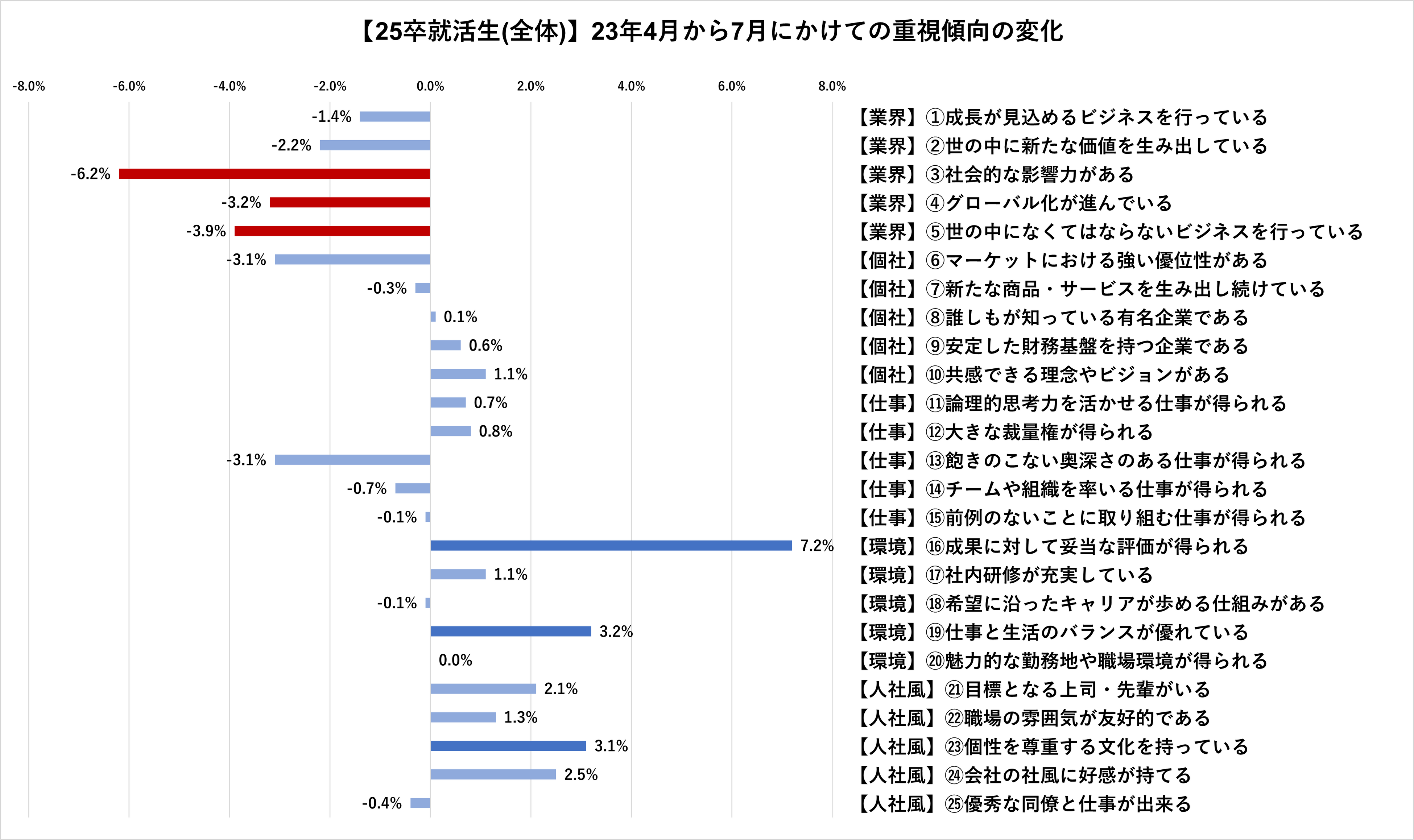 下図は、2023年4〜5月に実施した「25卒春 就活生調査」と今回の調査の、重視項目の回答率を比較した結果です。0%を基準に、回答率が高い項目は春より重視傾向が強まり、低い項目は春より重視傾向が弱まったことを示します。