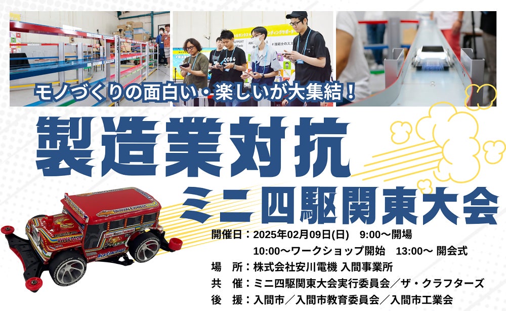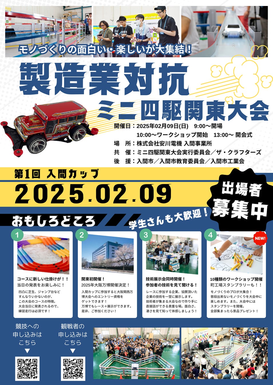 関西で開催実績のある『製造業対抗ミニ四駆大会』の”入間カップ”を開催します。レース参加者以外に、観戦者も大募集!大人の本気・モノづくりの楽しさを会場で感じてください。皆さんの参加をお待ちしています!