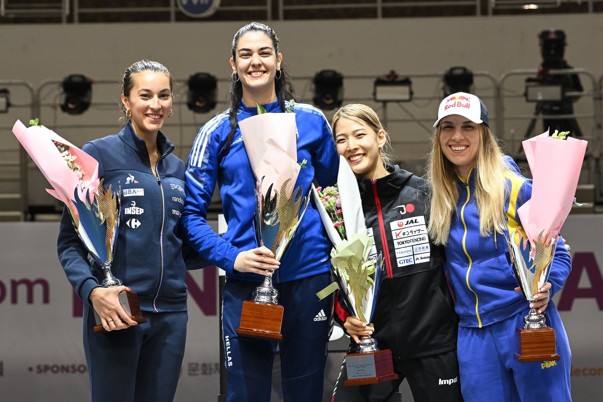 表彰式:左から、BALZER(FRA)、GKOUNTOURA(GER)、江村(日本)、KHARLAN(UKR)
