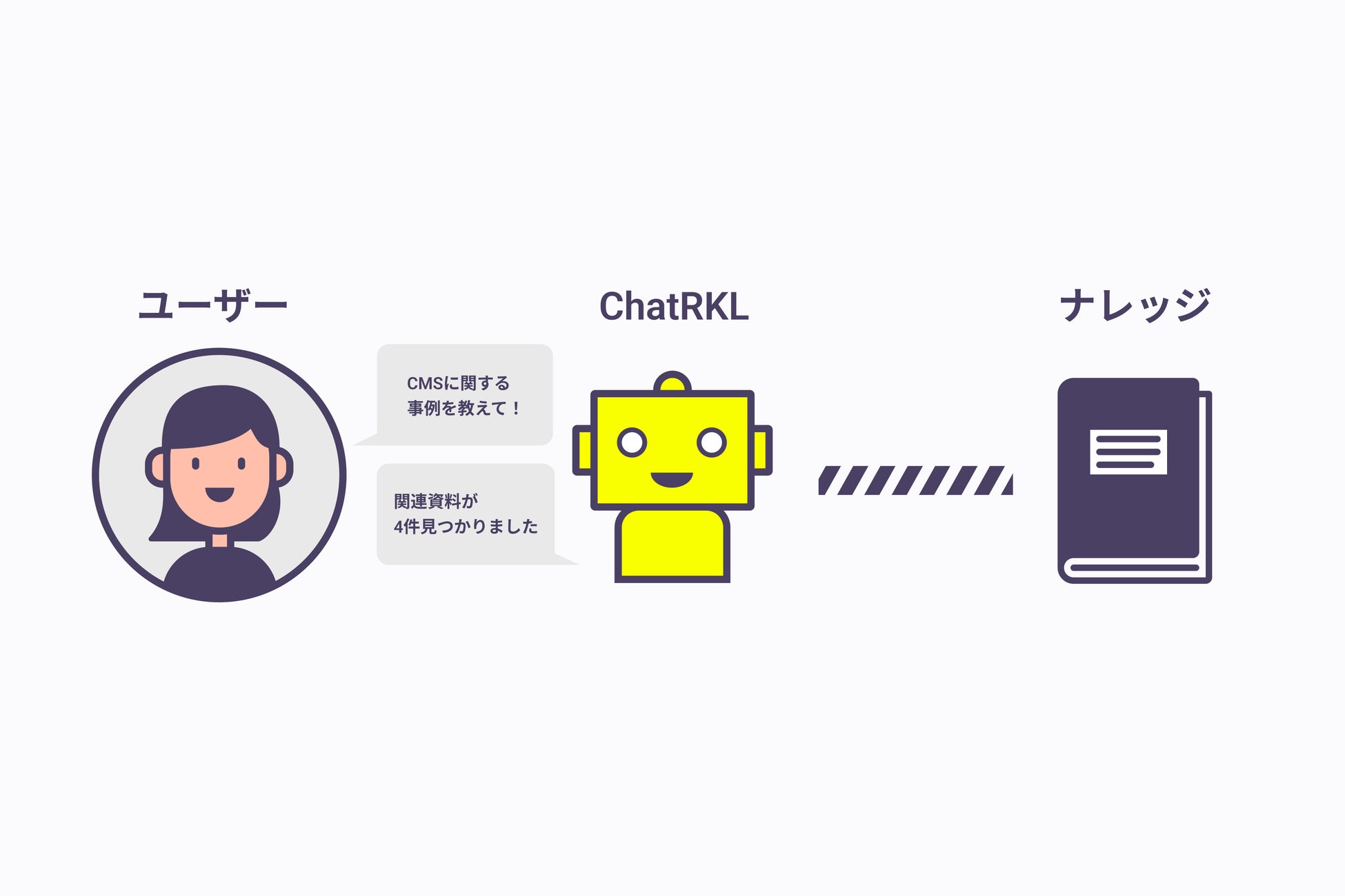 「ChatRKL」は自社内のナレッジ(過去のプロジェクト実績やその内容など)をslack上で呼び出せるチャットボットです。専用のメンションをつけることでシステムを呼び出し、データベースから適切なナレッジを検索・回答する仕組みです。