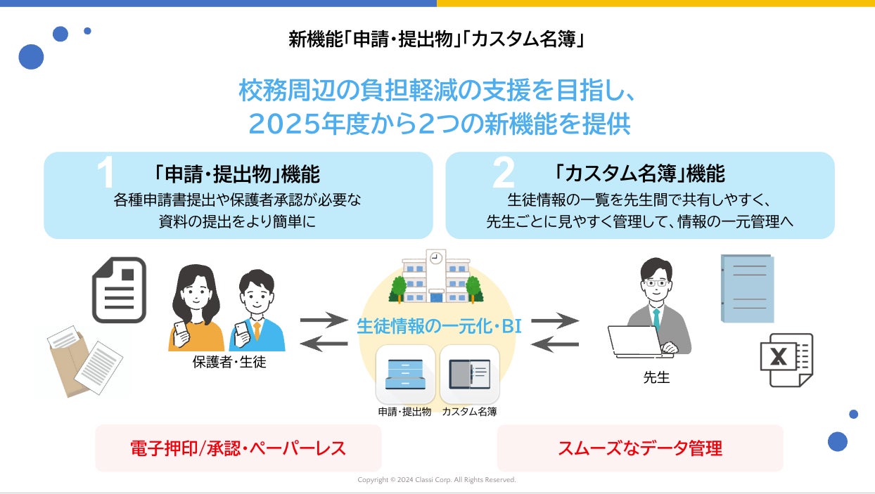 SchoolTech事業を展開するClassi株式会社(本社:東京都新宿区、代表取締役社長:竹岡 章、以下Classi)は、教育プラットフォーム「Classi(クラッシー)」に、2025年4月より申請・提出手続きと名簿更新などの校内の手続きを電子化する「申請・提出物」機能と「カスタム名簿」機能を搭載いたしますのでご報告いたします。