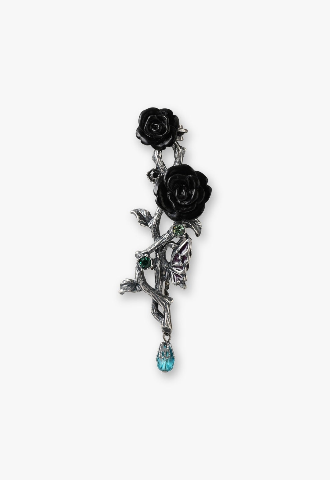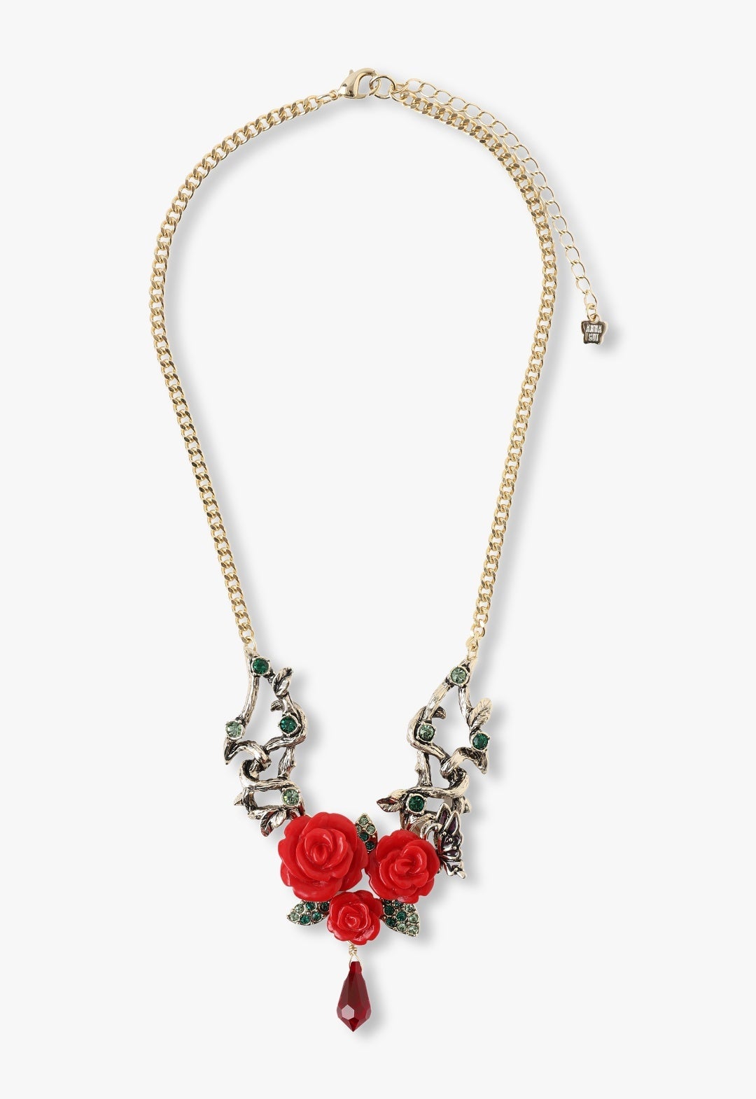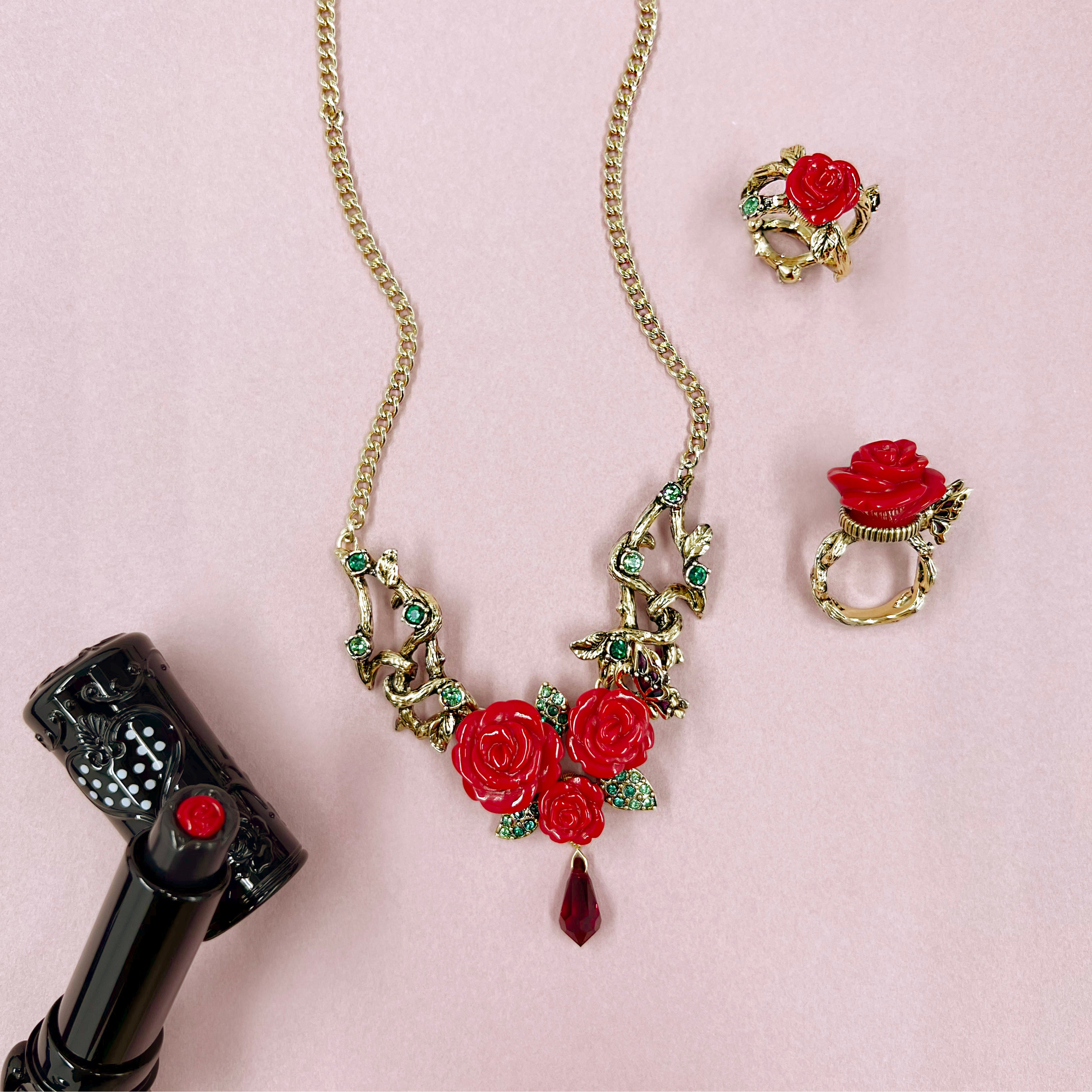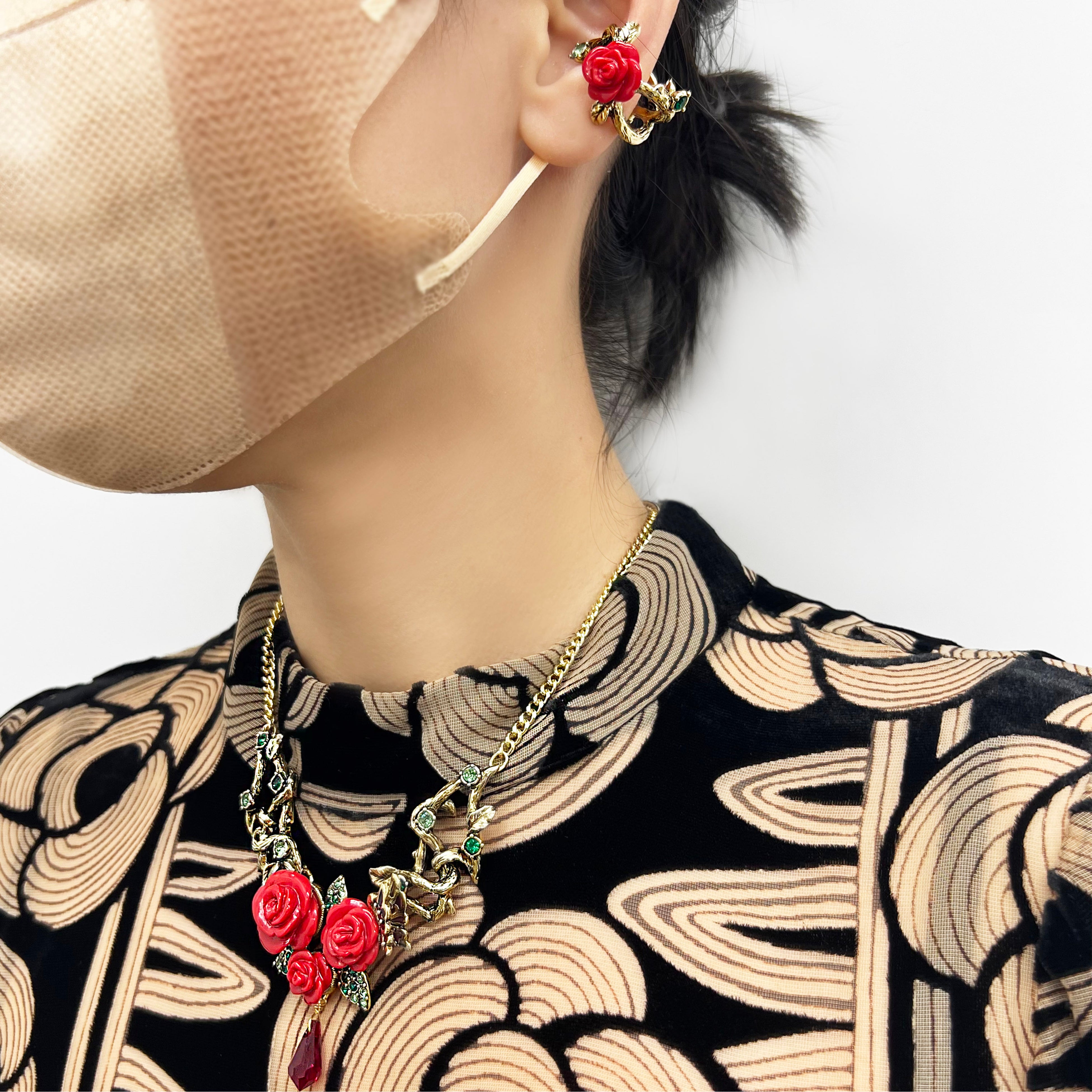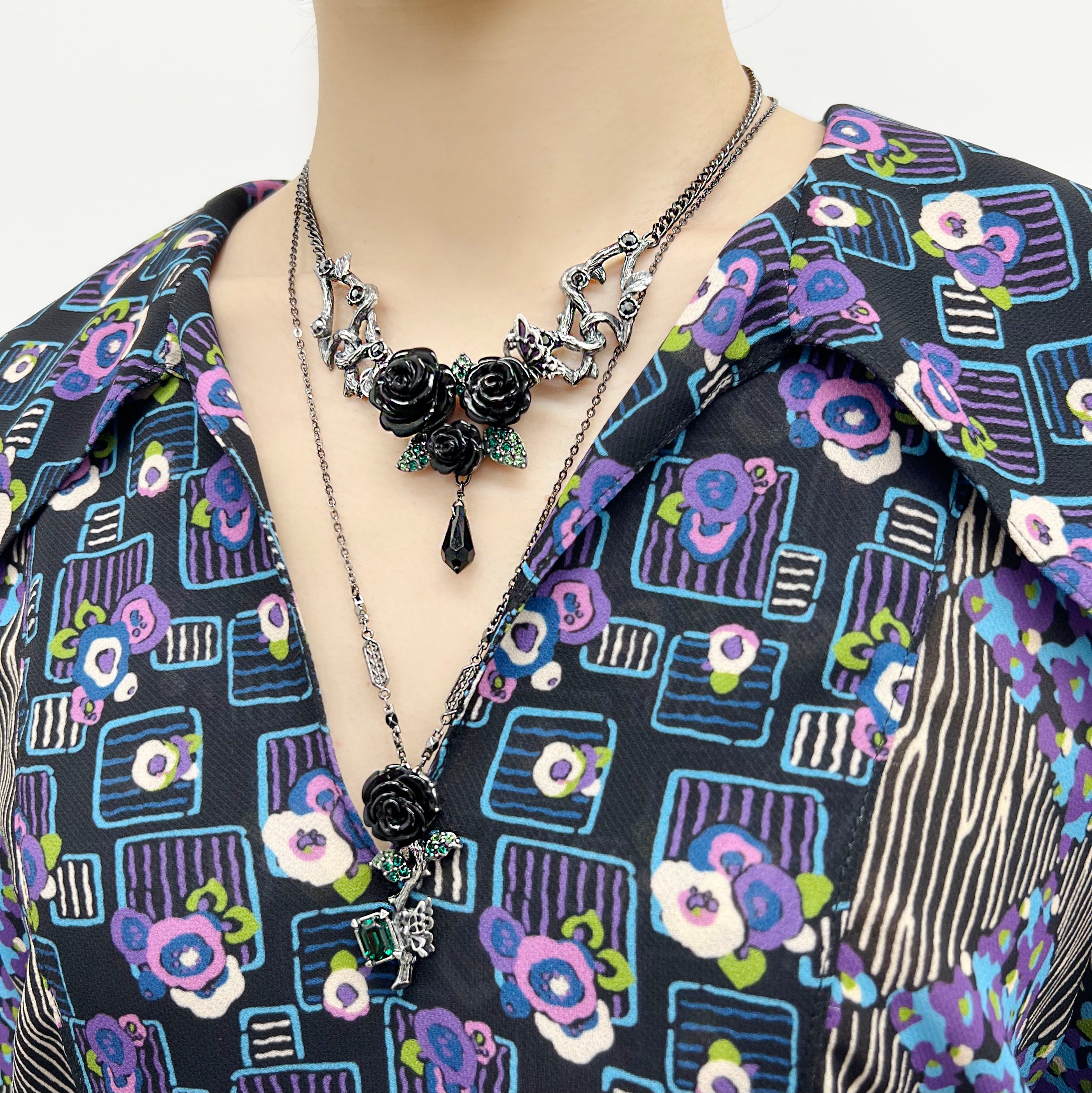 ネックレスは薔薇のサイドにコウモリの両翼の広がりをイメージした、存在感のあるデザインが魅力です。