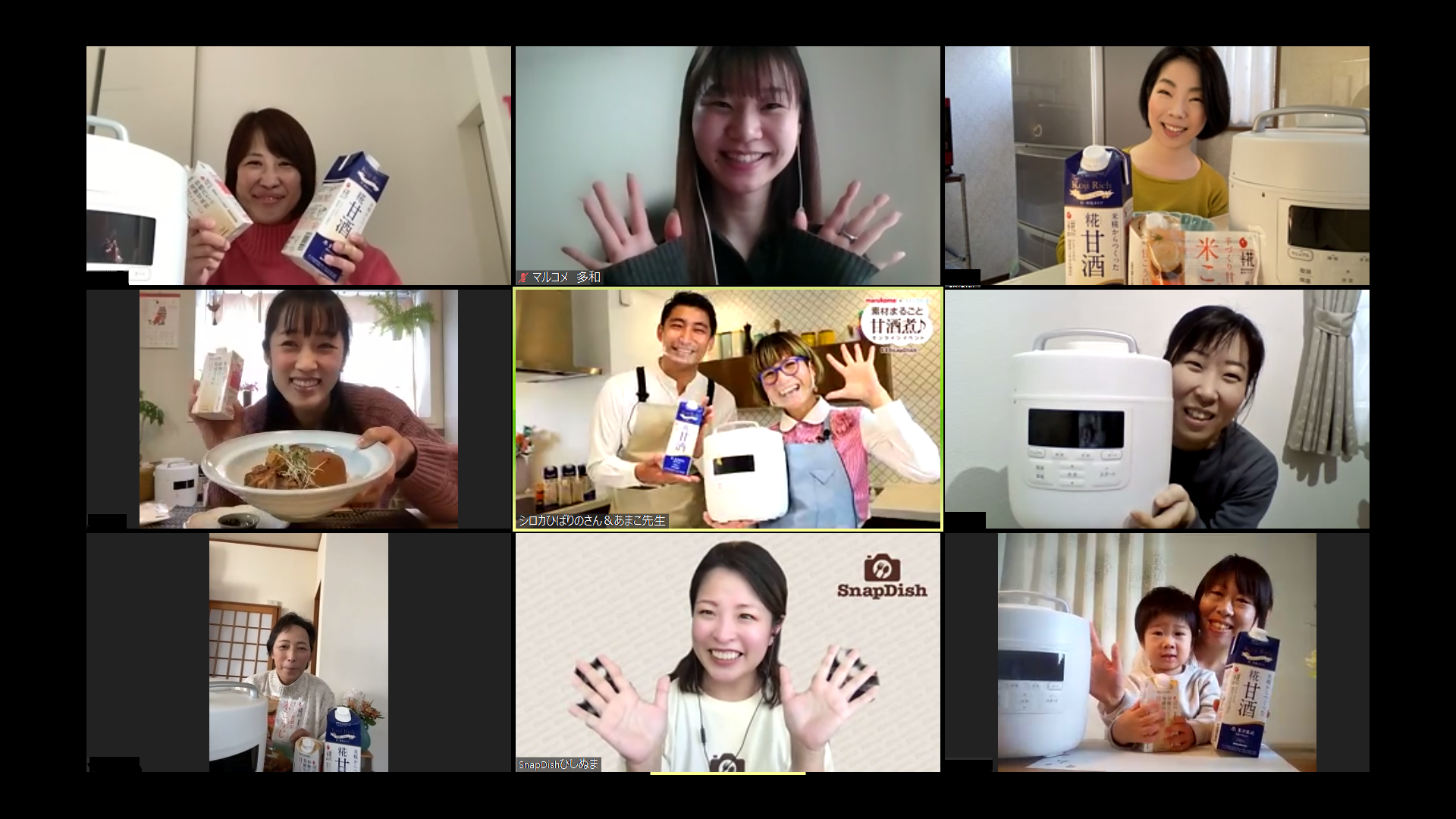 本イベントは SnapDishユーザーの中から抽選で選ばれた6名のモニターのみなさまにはご自宅からZoomでご参加いただき、SnapDishのYouTubeアカウントでも生配信でお送りしました。シロカの電気圧力鍋「おうちシェフPRO」とマルコメ社の「糀甘酒」についてご紹介したあと、フードコーディネーター・料理家のあまこようこ先生による「素材丸ごと甘酒煮」のレシピをご紹介。食材を丸ごと使った煮込み料理も、ほったらかし調理が可能な「おうちシェフPRO」なら簡単です。甘酒煮は、飲む点滴とも称される「糀甘酒」を使うことで栄養たっぷりで、砂糖を使わないのに糀由来のまろやかな甘みが感じられる、寒い冬にぴったりのメニューです。
