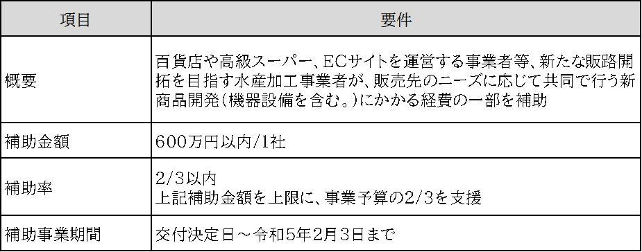 ECサイト等での販路開拓を目指すため、新たな商品開発に取組む水産加工事業者を募集し、商品開発にかかる経費の一部を補助