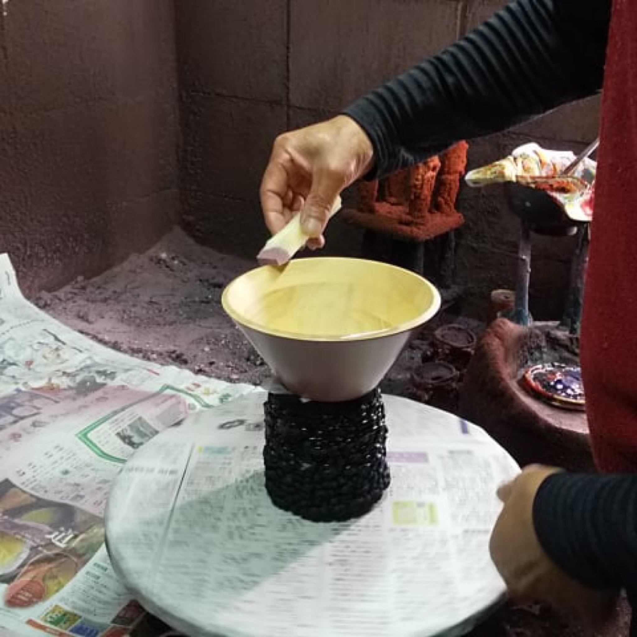 塗りを担当してくださった竹内さんの工房で、何度も色を作り、塗り直しと試行錯誤を繰り返したそう。竹内さんはエーデパでも取り扱いのある「漆器久太郎」の「Kyutarou BLUE」の塗りも担当されています。曽明さんの信頼も厚く、新しい取り組みにも積極的に取り組んでくださっているこの道40年のベテラン塗師です。