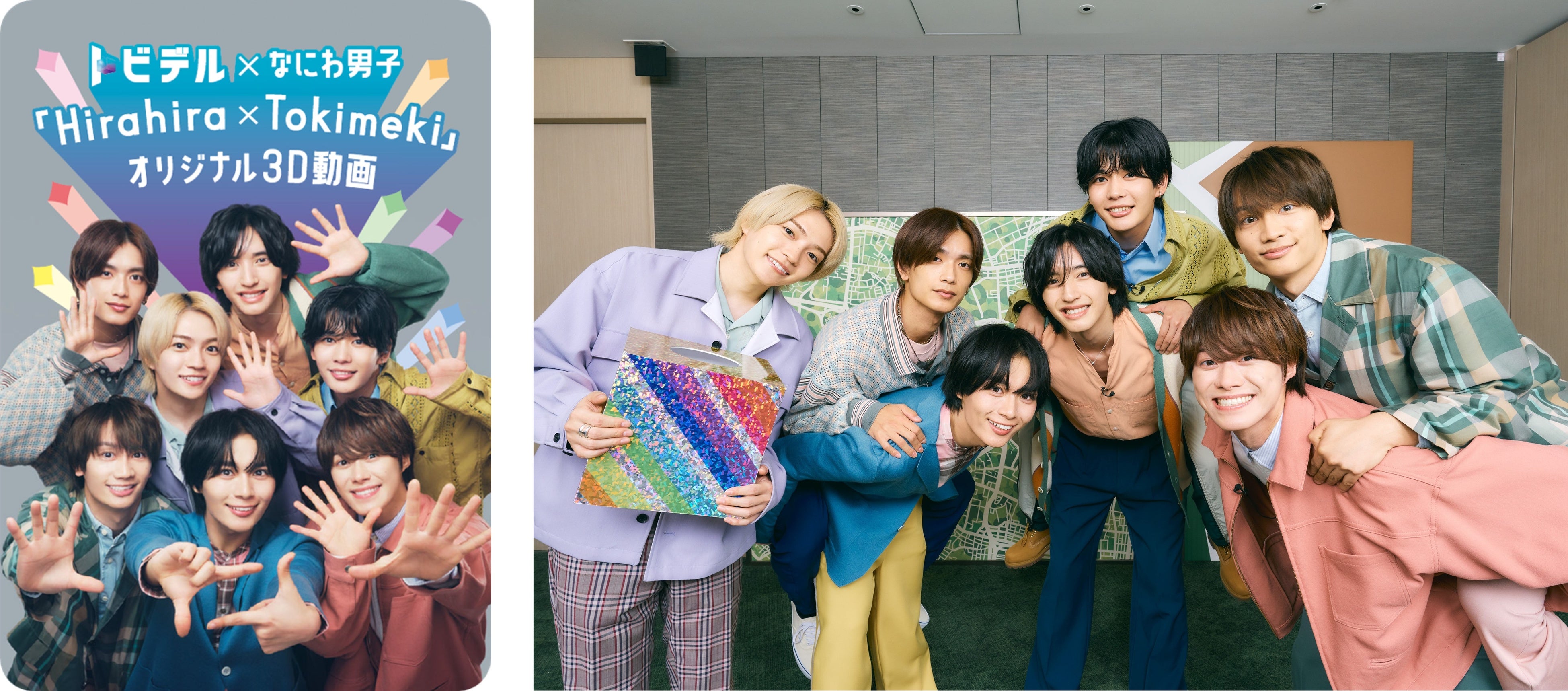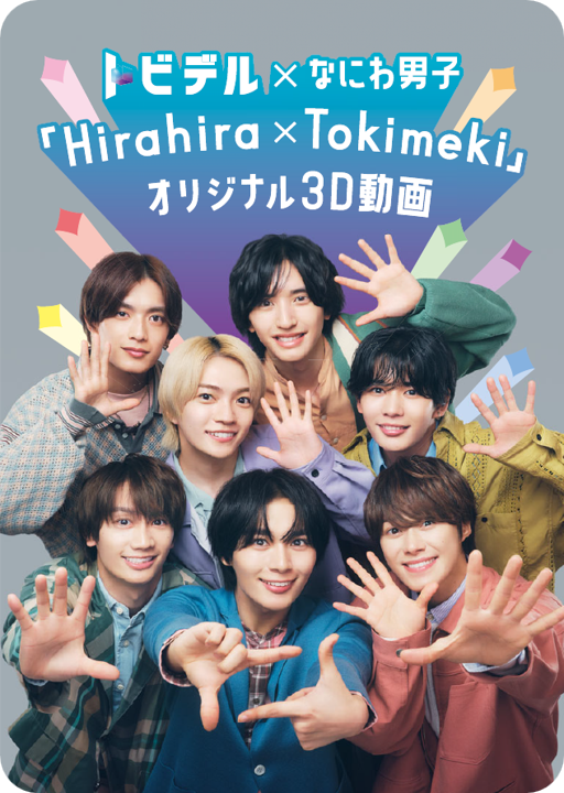 「なにわ男子×トビデル」オリジナル3D動画では、楽曲「Hirahira × Tokimeki」に合わせて、なにわ男子のメンバーを超接近で撮影した特別な3D動画を「トビデル」アプリ内で視聴できます。さらに、無料コンテンツでは、なにわ男子のメンバーが3Dの世界でさまざまな企画にチャレンジしています。メンバーが画面越しに超接近したり、即興パフォーマンスを披露したりと、なにわ男子の和気あいあいとした様子が詰まっています。「トビデル」ならではの、目の前に飛び出してくるような臨場感と、メンバーの自然な表情や掛け合いにぜひご注目ください。