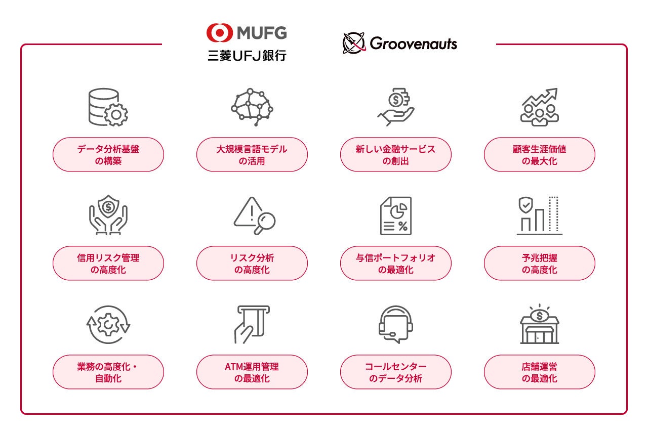 三菱UFJ銀行とグルーヴノーツは、本提携により、三菱UFJ銀行のDXの推進やデジタル人材育成の強化を図るとともに、ALM[3]の最適化に繋がる与信ポートフォリオおよび市場ポートフォリオなどのリスク管理の高度化、評判リスクやオペレーショナル・リスクに関する分析の精緻化、事務・オペレーションの効率化など、多様な領域において協業に取り組んでまいります。