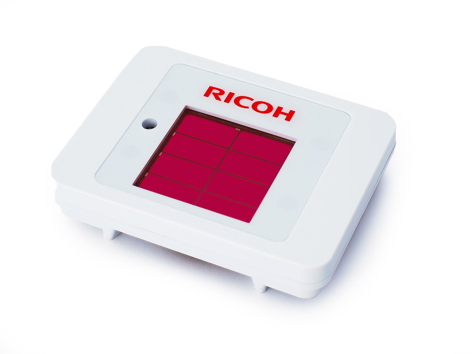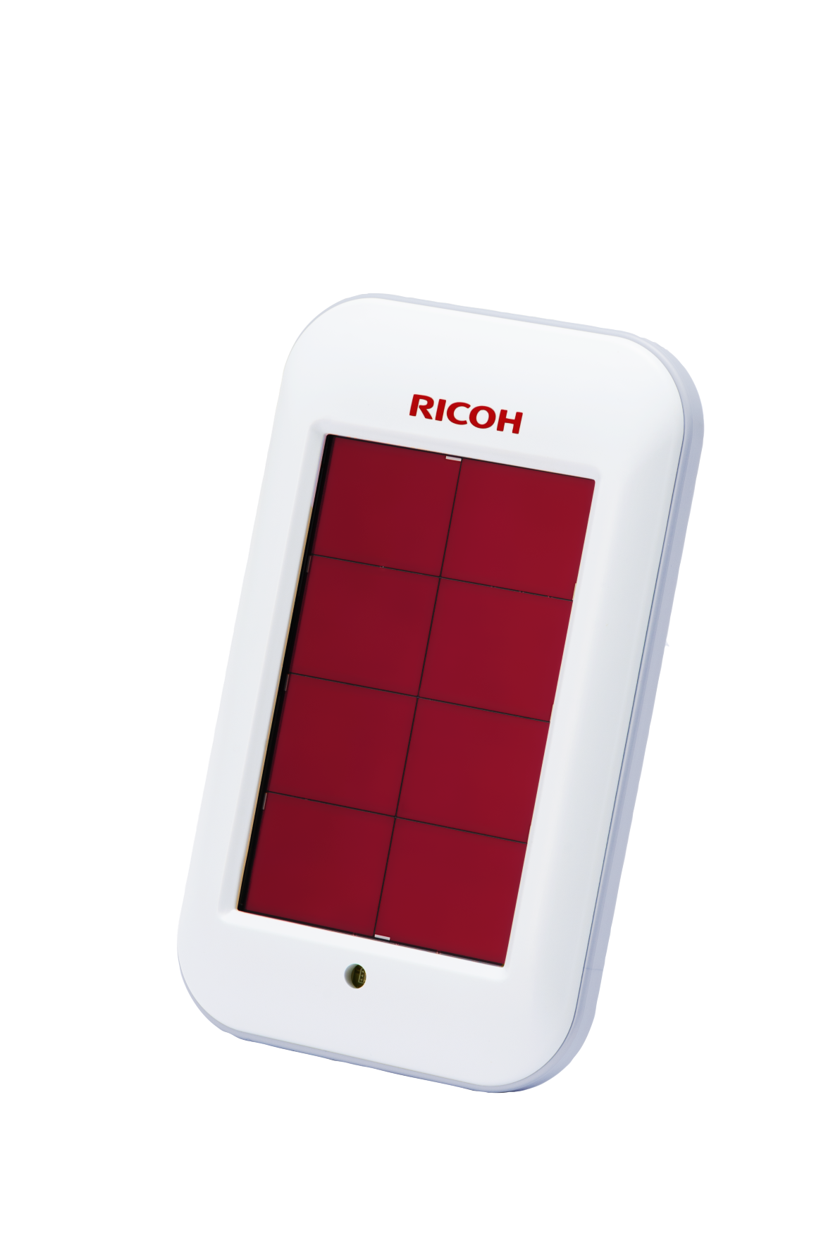 リコーが開発した固体型色素増感太陽電池モジュール「RICOH EH DSSCシリーズ」を搭載しているため、室内光で連続動作が可能で、無線通信を利用して環境情報を収集し、環境センサーを複数台配置することで広いフロアもリアルタイムに一元管理が可能です。屋内の温度・湿度・照度・気圧といった環境情報を電池交換レス・配線レスで取得できるセンシングデバイスです。