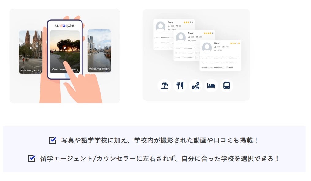 warpleでは他ユーザーの口コミや実際に撮影された動画が見ることができ、留学経験者の声をもとに自分にぴったりの語学学校をお選びいただけます。さらに、渡航前に実際の留学のイメージも掴むことができるため安心!