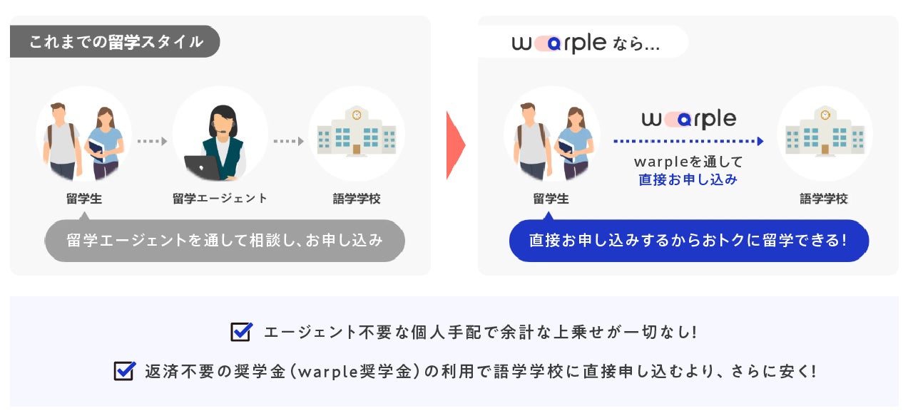 従来の留学では、人を介して留学手配を進めるスタイルが主流。warpleなら、直接語学学校へお申込みを行い余計な費用を省くことで、どこよりも安く留学を叶えることができます。また、返済不要の奨学金が利用できるため個人で直接お申込みをするよりもおトクです。