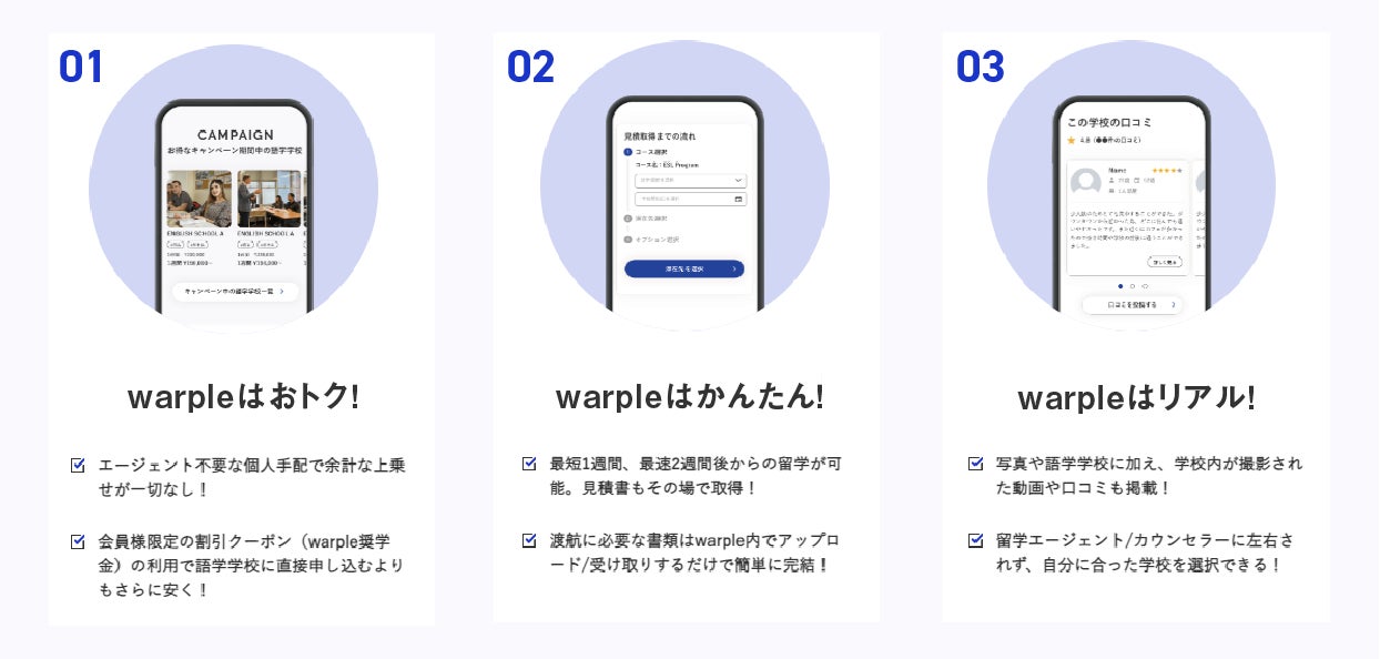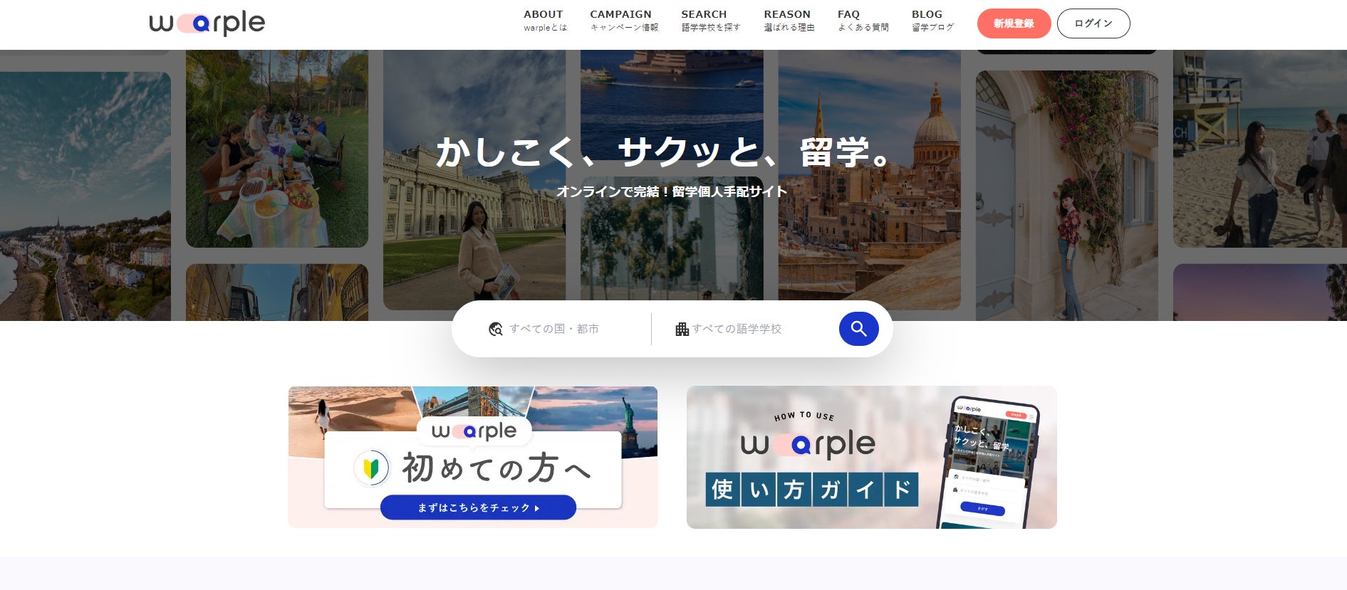 warpleはオンラインで完結する留学手配サイト。「おトク、かんたん、リアル」で、これまでにない方法で自分だけの留学プランを設計することができるサービスです。