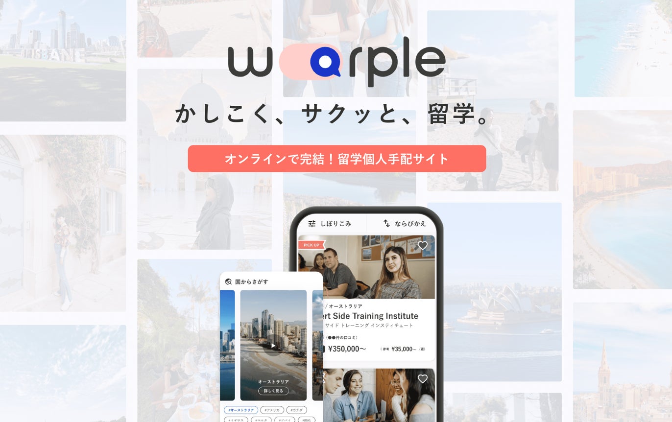 「warple(ワープル)」は、語学学校/プログラムの検索・お申込み、渡航までの準備、学校/宿泊先の手配など、全てをオンライン上で完結でき、どこよりも安く留学が実現できる"日本初"のサービスです。