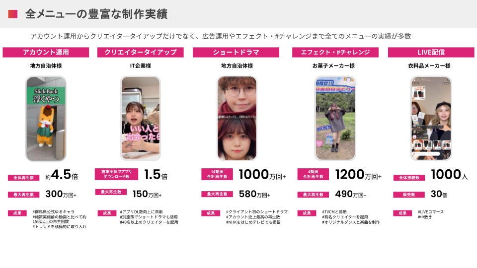 また、クリエイター事務所機能を抱えていることで、クリエイター視点でのコンテンツ制作も取り入れられており、TikTokにおいて、コンテンツ制作をする上での強みとなっております。