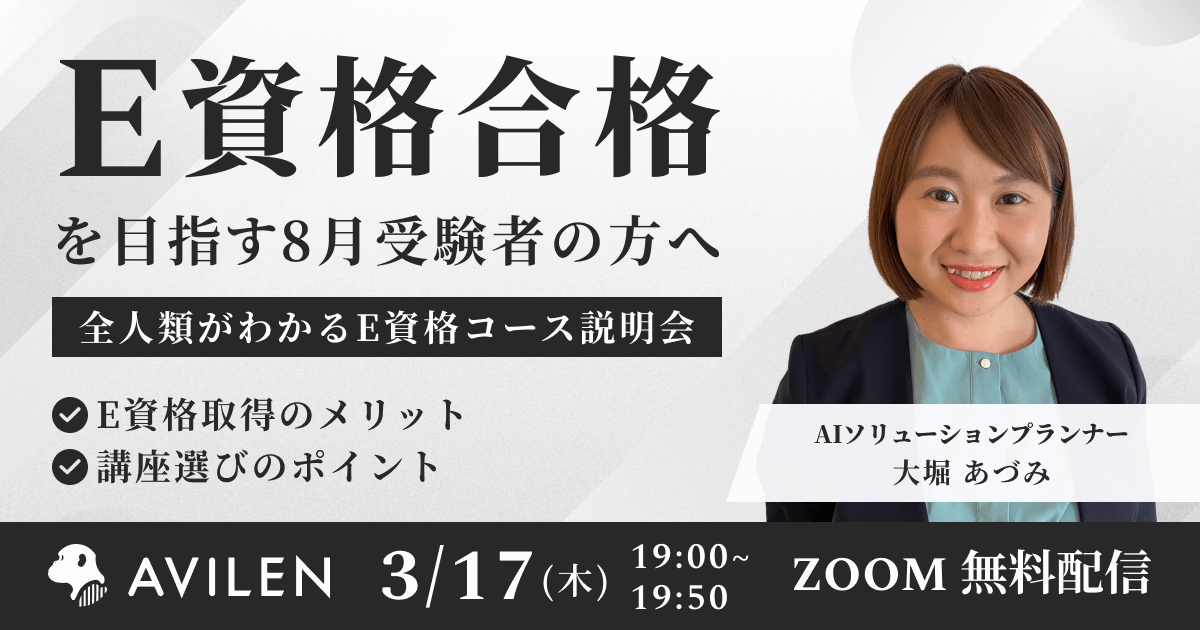株式会社AVILEN(東京都中央区 代表取締役 高橋 光太郎 以下、AVILEN)は、2022年3月17日(木)19時から、2022年8月のE資格を目指す方向けの「全人類がわかるE資格コース」のオンライン説明会を開催します。